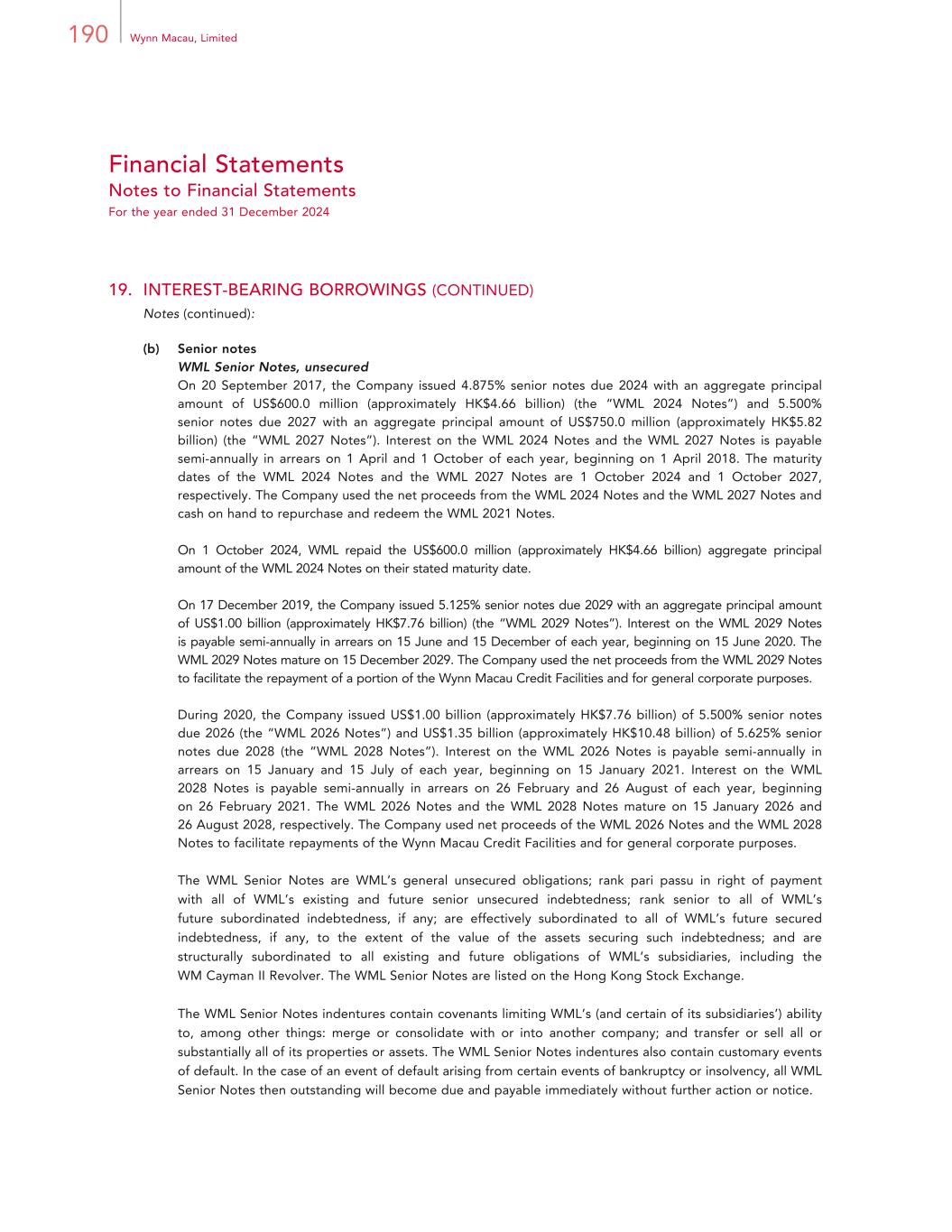 190 Wynn Macau, Limited Financial Statements Notes to Financial Statements For the year ended 31 December 2024 19. INTEREST-BEARING BORROWINGS (CONTINUED) Notes (continued): (b) Senior notes WML Senior Notes, unsecured On 20 September 2017, the Company issued 4.875% senior notes due 2024 with an aggregate principal amount of US$600.0 million (approximately HK$4.66 billion) (the “WML 2024 Notes”) and 5.500% senior notes due 2027 with an aggregate principal amount of US$750.0 million (approximately HK$5.82 billion) (the “WML 2027 Notes”). Interest on the WML 2024 Notes and the WML 2027 Notes is payable semi-annually in arrears on 1 April and 1 October of each year, beginning on 1 April 2018. The maturity dates of the WML 2024 Notes and the WML 2027 Notes are 1 October 2024 and 1 October 2027, respectively. The Company used the net proceeds from the WML 2024 Notes and the WML 2027 Notes and cash on hand to repurchase and redeem the WML 2021 Notes. On 1 October 2024, WML repaid the US$600.0 million (approximately HK$4.66 billion) aggregate principal amount of the WML 2024 Notes on their stated maturity date. On 17 December 2019, the Company issued 5.125% senior notes due 2029 with an aggregate principal amount of US$1.00 billion (approximately HK$7.76 billion) (the “WML 2029 Notes”). Interest on the WML 2029 Notes is payable semi-annually in arrears on 15 June and 15 December of each year, beginning on 15 June 2020. The WML 2029 Notes mature on 15 December 2029. The Company used the net proceeds from the WML 2029 Notes to facilitate the repayment of a portion of the Wynn Macau Credit Facilities and for general corporate purposes. During 2020, the Company issued US$1.00 billion (approximately HK$7.76 billion) of 5.500% senior notes due 2026 (the “WML 2026 Notes”) and US$1.35 billion (approximately HK$10.48 billion) of 5.625% senior notes due 2028 (the “WML 2028 Notes”). Interest on the WML 2026 Notes is payable semi-annually in arrears on 15 January and 15 July of each year, beginning on 15 January 2021. Interest on the WML 2028 Notes is payable semi-annually in arrears on 26 February and 26 August of each year, beginning on 26 February 2021. The WML 2026 Notes and the WML 2028 Notes mature on 15 January 2026 and 26 August 2028, respectively. The Company used net proceeds of the WML 2026 Notes and the WML 2028 Notes to facilitate repayments of the Wynn Macau Credit Facilities and for general corporate purposes. The WML Senior Notes are WML’s general unsecured obligations; rank pari passu in right of payment with all of WML’s existing and future senior unsecured indebtedness; rank senior to all of WML’s future subordinated indebtedness, if any; are effectively subordinated to all of WML’s future secured indebtedness, if any, to the extent of the value of the assets securing such indebtedness; and are structurally subordinated to all existing and future obligations of WML’s subsidiaries, including the WM Cayman II Revolver. The WML Senior Notes are listed on the Hong Kong Stock Exchange. The WML Senior Notes indentures contain covenants limiting WML’s (and certain of its subsidiaries’) ability to, among other things: merge or consolidate with or into another company; and transfer or sell all or substantially all of its properties or assets. The WML Senior Notes indentures also contain customary events of default. In the case of an event of default arising from certain events of bankruptcy or insolvency, all WML Senior Notes then outstanding will become due and payable immediately without further action or notice.