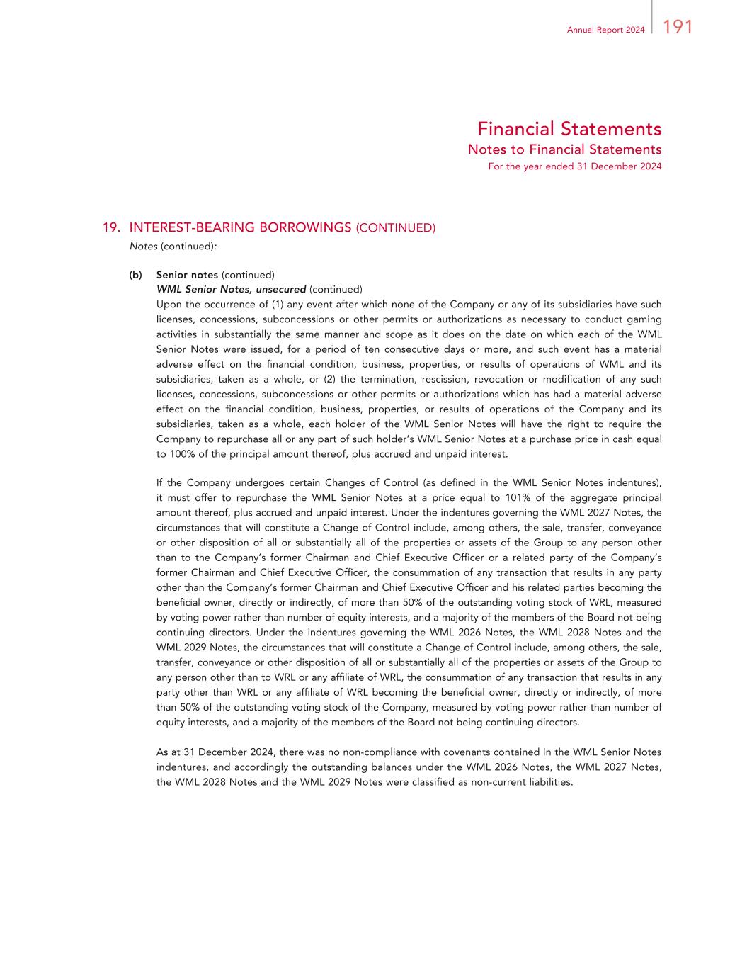 191Annual Report 2024 Financial Statements Notes to Financial Statements For the year ended 31 December 2024 19. INTEREST-BEARING BORROWINGS (CONTINUED) Notes (continued): (b) Senior notes (continued) WML Senior Notes, unsecured (continued) Upon the occurrence of (1) any event after which none of the Company or any of its subsidiaries have such licenses, concessions, subconcessions or other permits or authorizations as necessary to conduct gaming activities in substantially the same manner and scope as it does on the date on which each of the WML Senior Notes were issued, for a period of ten consecutive days or more, and such event has a material adverse effect on the financial condition, business, properties, or results of operations of WML and its subsidiaries, taken as a whole, or (2) the termination, rescission, revocation or modification of any such licenses, concessions, subconcessions or other permits or authorizations which has had a material adverse effect on the financial condition, business, properties, or results of operations of the Company and its subsidiaries, taken as a whole, each holder of the WML Senior Notes will have the right to require the Company to repurchase all or any part of such holder’s WML Senior Notes at a purchase price in cash equal to 100% of the principal amount thereof, plus accrued and unpaid interest. If the Company undergoes certain Changes of Control (as defined in the WML Senior Notes indentures), it must offer to repurchase the WML Senior Notes at a price equal to 101% of the aggregate principal amount thereof, plus accrued and unpaid interest. Under the indentures governing the WML 2027 Notes, the circumstances that will constitute a Change of Control include, among others, the sale, transfer, conveyance or other disposition of all or substantially all of the properties or assets of the Group to any person other than to the Company’s former Chairman and Chief Executive Officer or a related party of the Company’s former Chairman and Chief Executive Officer, the consummation of any transaction that results in any party other than the Company’s former Chairman and Chief Executive Officer and his related parties becoming the beneficial owner, directly or indirectly, of more than 50% of the outstanding voting stock of WRL, measured by voting power rather than number of equity interests, and a majority of the members of the Board not being continuing directors. Under the indentures governing the WML 2026 Notes, the WML 2028 Notes and the WML 2029 Notes, the circumstances that will constitute a Change of Control include, among others, the sale, transfer, conveyance or other disposition of all or substantially all of the properties or assets of the Group to any person other than to WRL or any affiliate of WRL, the consummation of any transaction that results in any party other than WRL or any affiliate of WRL becoming the beneficial owner, directly or indirectly, of more than 50% of the outstanding voting stock of the Company, measured by voting power rather than number of equity interests, and a majority of the members of the Board not being continuing directors. As at 31 December 2024, there was no non-compliance with covenants contained in the WML Senior Notes indentures, and accordingly the outstanding balances under the WML 2026 Notes, the WML 2027 Notes, the WML 2028 Notes and the WML 2029 Notes were classified as non-current liabilities.