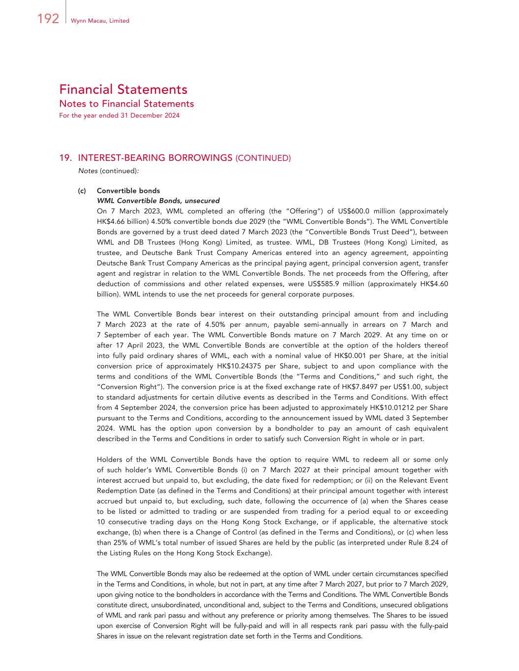 192 Wynn Macau, Limited Financial Statements Notes to Financial Statements For the year ended 31 December 2024 19. INTEREST-BEARING BORROWINGS (CONTINUED) Notes (continued): (c) Convertible bonds WML Convertible Bonds, unsecured On 7 March 2023, WML completed an offering (the “Offering”) of US$600.0 million (approximately HK$4.66 billion) 4.50% convertible bonds due 2029 (the “WML Convertible Bonds”). The WML Convertible Bonds are governed by a trust deed dated 7 March 2023 (the “Convertible Bonds Trust Deed”), between WML and DB Trustees (Hong Kong) Limited, as trustee. WML, DB Trustees (Hong Kong) Limited, as trustee, and Deutsche Bank Trust Company Americas entered into an agency agreement, appointing Deutsche Bank Trust Company Americas as the principal paying agent, principal conversion agent, transfer agent and registrar in relation to the WML Convertible Bonds. The net proceeds from the Offering, after deduction of commissions and other related expenses, were US$585.9 million (approximately HK$4.60 billion). WML intends to use the net proceeds for general corporate purposes. The WML Convertible Bonds bear interest on their outstanding principal amount from and including 7 March 2023 at the rate of 4.50% per annum, payable semi-annually in arrears on 7 March and 7 September of each year. The WML Convertible Bonds mature on 7 March 2029. At any time on or after 17 April 2023, the WML Convertible Bonds are convertible at the option of the holders thereof into fully paid ordinary shares of WML, each with a nominal value of HK$0.001 per Share, at the initial conversion price of approximately HK$10.24375 per Share, subject to and upon compliance with the terms and conditions of the WML Convertible Bonds (the “Terms and Conditions,” and such right, the “Conversion Right”). The conversion price is at the fixed exchange rate of HK$7.8497 per US$1.00, subject to standard adjustments for certain dilutive events as described in the Terms and Conditions. With effect from 4 September 2024, the conversion price has been adjusted to approximately HK$10.01212 per Share pursuant to the Terms and Conditions, according to the announcement issued by WML dated 3 September 2024. WML has the option upon conversion by a bondholder to pay an amount of cash equivalent described in the Terms and Conditions in order to satisfy such Conversion Right in whole or in part. Holders of the WML Convertible Bonds have the option to require WML to redeem all or some only of such holder’s WML Convertible Bonds (i) on 7 March 2027 at their principal amount together with interest accrued but unpaid to, but excluding, the date fixed for redemption; or (ii) on the Relevant Event Redemption Date (as defined in the Terms and Conditions) at their principal amount together with interest accrued but unpaid to, but excluding, such date, following the occurrence of (a) when the Shares cease to be listed or admitted to trading or are suspended from trading for a period equal to or exceeding 10 consecutive trading days on the Hong Kong Stock Exchange, or if applicable, the alternative stock exchange, (b) when there is a Change of Control (as defined in the Terms and Conditions), or (c) when less than 25% of WML’s total number of issued Shares are held by the public (as interpreted under Rule 8.24 of the Listing Rules on the Hong Kong Stock Exchange). The WML Convertible Bonds may also be redeemed at the option of WML under certain circumstances specified in the Terms and Conditions, in whole, but not in part, at any time after 7 March 2027, but prior to 7 March 2029, upon giving notice to the bondholders in accordance with the Terms and Conditions. The WML Convertible Bonds constitute direct, unsubordinated, unconditional and, subject to the Terms and Conditions, unsecured obligations of WML and rank pari passu and without any preference or priority among themselves. The Shares to be issued upon exercise of Conversion Right will be fully-paid and will in all respects rank pari passu with the fully-paid Shares in issue on the relevant registration date set forth in the Terms and Conditions.
