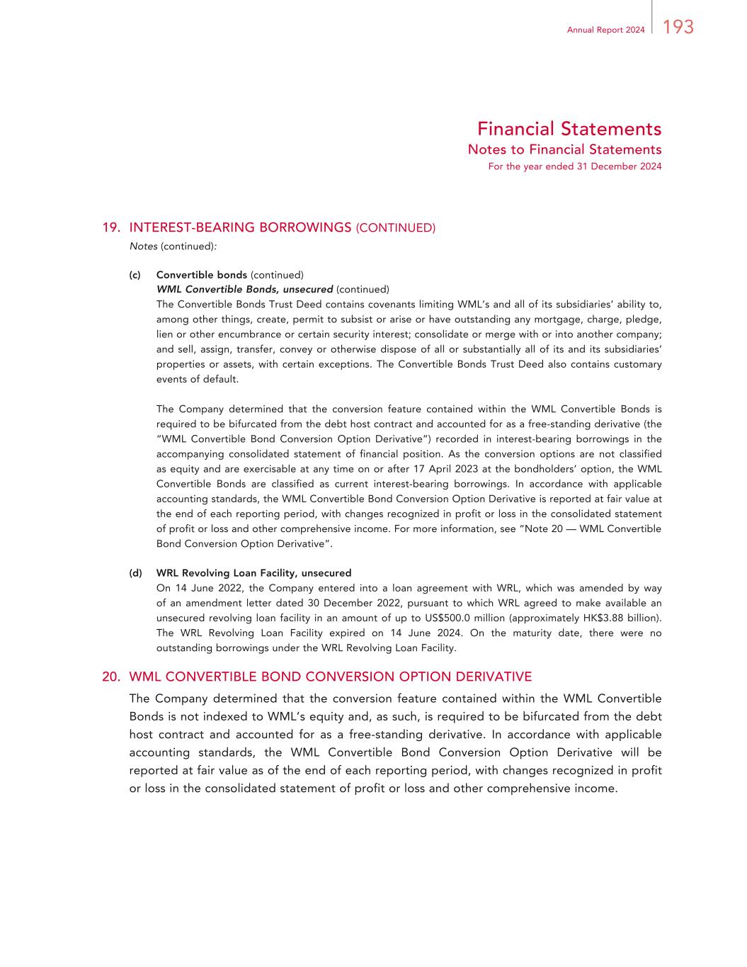 193Annual Report 2024 Financial Statements Notes to Financial Statements For the year ended 31 December 2024 19. INTEREST-BEARING BORROWINGS (CONTINUED) Notes (continued): (c) Convertible bonds (continued) WML Convertible Bonds, unsecured (continued) The Convertible Bonds Trust Deed contains covenants limiting WML’s and all of its subsidiaries’ ability to, among other things, create, permit to subsist or arise or have outstanding any mortgage, charge, pledge, lien or other encumbrance or certain security interest; consolidate or merge with or into another company; and sell, assign, transfer, convey or otherwise dispose of all or substantially all of its and its subsidiaries’ properties or assets, with certain exceptions. The Convertible Bonds Trust Deed also contains customary events of default. The Company determined that the conversion feature contained within the WML Convertible Bonds is required to be bifurcated from the debt host contract and accounted for as a free-standing derivative (the “WML Convertible Bond Conversion Option Derivative”) recorded in interest-bearing borrowings in the accompanying consolidated statement of financial position. As the conversion options are not classified as equity and are exercisable at any time on or after 17 April 2023 at the bondholders’ option, the WML Convertible Bonds are classified as current interest-bearing borrowings. In accordance with applicable accounting standards, the WML Convertible Bond Conversion Option Derivative is reported at fair value at the end of each reporting period, with changes recognized in profit or loss in the consolidated statement of profit or loss and other comprehensive income. For more information, see “Note 20 — WML Convertible Bond Conversion Option Derivative”. (d) WRL Revolving Loan Facility, unsecured On 14 June 2022, the Company entered into a loan agreement with WRL, which was amended by way of an amendment letter dated 30 December 2022, pursuant to which WRL agreed to make available an unsecured revolving loan facility in an amount of up to US$500.0 million (approximately HK$3.88 billion). The WRL Revolving Loan Facility expired on 14 June 2024. On the maturity date, there were no outstanding borrowings under the WRL Revolving Loan Facility. 20. WML CONVERTIBLE BOND CONVERSION OPTION DERIVATIVE The Company determined that the conversion feature contained within the WML Convertible Bonds is not indexed to WML’s equity and, as such, is required to be bifurcated from the debt host contract and accounted for as a free-standing derivative. In accordance with applicable accounting standards, the WML Convertible Bond Conversion Option Derivative will be reported at fair value as of the end of each reporting period, with changes recognized in profit or loss in the consolidated statement of profit or loss and other comprehensive income.