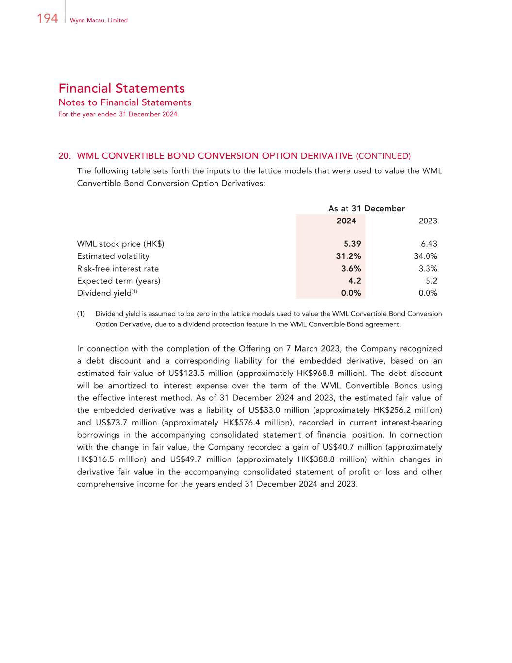 194 Wynn Macau, Limited Financial Statements Notes to Financial Statements For the year ended 31 December 2024 20. WML CONVERTIBLE BOND CONVERSION OPTION DERIVATIVE (CONTINUED) The following table sets forth the inputs to the lattice models that were used to value the WML Convertible Bond Conversion Option Derivatives: As at 31 December 2024 2023 WML stock price (HK$) 5.39 6.43 Estimated volatility 31.2% 34.0% Risk-free interest rate 3.6% 3.3% Expected term (years) 4.2 5.2 Dividend yield(1) 0.0% 0.0% (1) Dividend yield is assumed to be zero in the lattice models used to value the WML Convertible Bond Conversion Option Derivative, due to a dividend protection feature in the WML Convertible Bond agreement. In connection with the completion of the Offering on 7 March 2023, the Company recognized a debt discount and a corresponding liability for the embedded derivative, based on an estimated fair value of US$123.5 million (approximately HK$968.8 million). The debt discount will be amortized to interest expense over the term of the WML Convertible Bonds using the effective interest method. As of 31 December 2024 and 2023, the estimated fair value of the embedded derivative was a liability of US$33.0 million (approximately HK$256.2 million) and US$73.7 million (approximately HK$576.4 million), recorded in current interest-bearing borrowings in the accompanying consolidated statement of financial position. In connection with the change in fair value, the Company recorded a gain of US$40.7 million (approximately HK$316.5 million) and US$49.7 million (approximately HK$388.8 million) within changes in derivative fair value in the accompanying consolidated statement of profit or loss and other comprehensive income for the years ended 31 December 2024 and 2023.