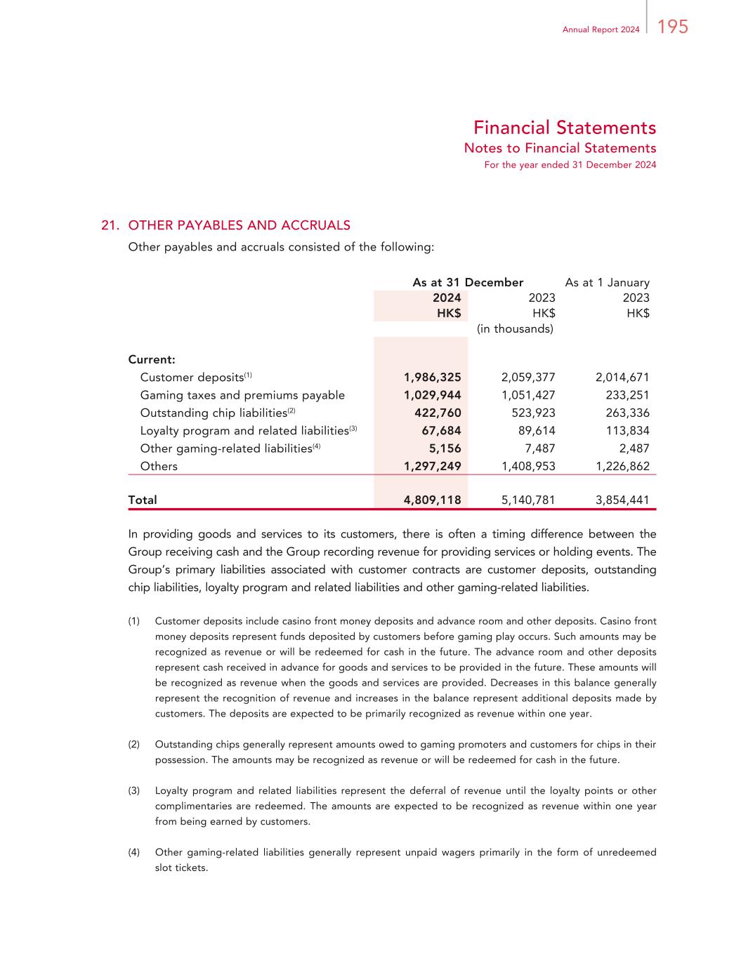 195Annual Report 2024 Financial Statements Notes to Financial Statements For the year ended 31 December 2024 21. OTHER PAYABLES AND ACCRUALS Other payables and accruals consisted of the following: As at 31 December As at 1 January 2024 2023 2023 HK$ HK$ HK$ (in thousands) Current: Customer deposits(1) 1,986,325 2,059,377 2,014,671 Gaming taxes and premiums payable 1,029,944 1,051,427 233,251 Outstanding chip liabilities(2) 422,760 523,923 263,336 Loyalty program and related liabilities(3) 67,684 89,614 113,834 Other gaming-related liabilities(4) 5,156 7,487 2,487 Others 1,297,249 1,408,953 1,226,862 Total 4,809,118 5,140,781 3,854,441 In providing goods and services to its customers, there is often a timing difference between the Group receiving cash and the Group recording revenue for providing services or holding events. The Group’s primary liabilities associated with customer contracts are customer deposits, outstanding chip liabilities, loyalty program and related liabilities and other gaming-related liabilities. (1) Customer deposits include casino front money deposits and advance room and other deposits. Casino front money deposits represent funds deposited by customers before gaming play occurs. Such amounts may be recognized as revenue or will be redeemed for cash in the future. The advance room and other deposits represent cash received in advance for goods and services to be provided in the future. These amounts will be recognized as revenue when the goods and services are provided. Decreases in this balance generally represent the recognition of revenue and increases in the balance represent additional deposits made by customers. The deposits are expected to be primarily recognized as revenue within one year. (2) Outstanding chips generally represent amounts owed to gaming promoters and customers for chips in their possession. The amounts may be recognized as revenue or will be redeemed for cash in the future. (3) Loyalty program and related liabilities represent the deferral of revenue until the loyalty points or other complimentaries are redeemed. The amounts are expected to be recognized as revenue within one year from being earned by customers. (4) Other gaming-related liabilities generally represent unpaid wagers primarily in the form of unredeemed slot tickets.