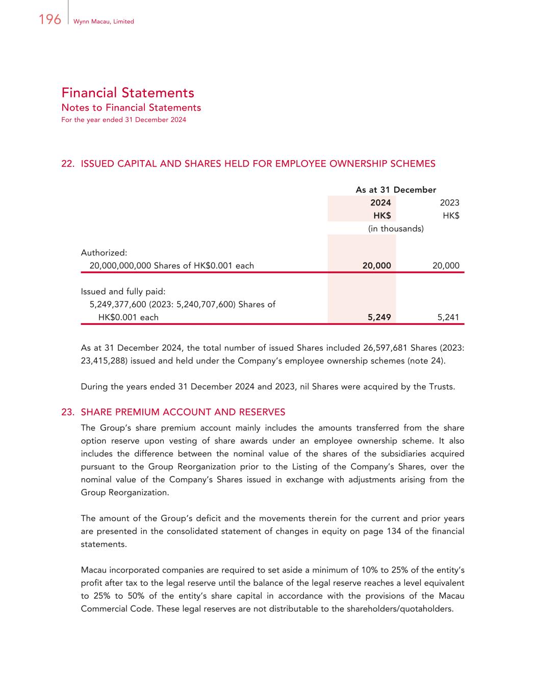 196 Wynn Macau, Limited Financial Statements Notes to Financial Statements For the year ended 31 December 2024 22. ISSUED CAPITAL AND SHARES HELD FOR EMPLOYEE OWNERSHIP SCHEMES As at 31 December 2024 2023 HK$ HK$ (in thousands) Authorized: 20,000,000,000 Shares of HK$0.001 each 20,000 20,000 Issued and fully paid: 5,249,377,600 (2023: 5,240,707,600) Shares of HK$0.001 each 5,249 5,241 As at 31 December 2024, the total number of issued Shares included 26,597,681 Shares (2023: 23,415,288) issued and held under the Company’s employee ownership schemes (note 24). During the years ended 31 December 2024 and 2023, nil Shares were acquired by the Trusts. 23. SHARE PREMIUM ACCOUNT AND RESERVES The Group’s share premium account mainly includes the amounts transferred from the share option reserve upon vesting of share awards under an employee ownership scheme. It also includes the difference between the nominal value of the shares of the subsidiaries acquired pursuant to the Group Reorganization prior to the Listing of the Company’s Shares, over the nominal value of the Company’s Shares issued in exchange with adjustments arising from the Group Reorganization. The amount of the Group’s deficit and the movements therein for the current and prior years are presented in the consolidated statement of changes in equity on page 134 of the financial statements. Macau incorporated companies are required to set aside a minimum of 10% to 25% of the entity’s profit after tax to the legal reserve until the balance of the legal reserve reaches a level equivalent to 25% to 50% of the entity’s share capital in accordance with the provisions of the Macau Commercial Code. These legal reserves are not distributable to the shareholders/quotaholders.