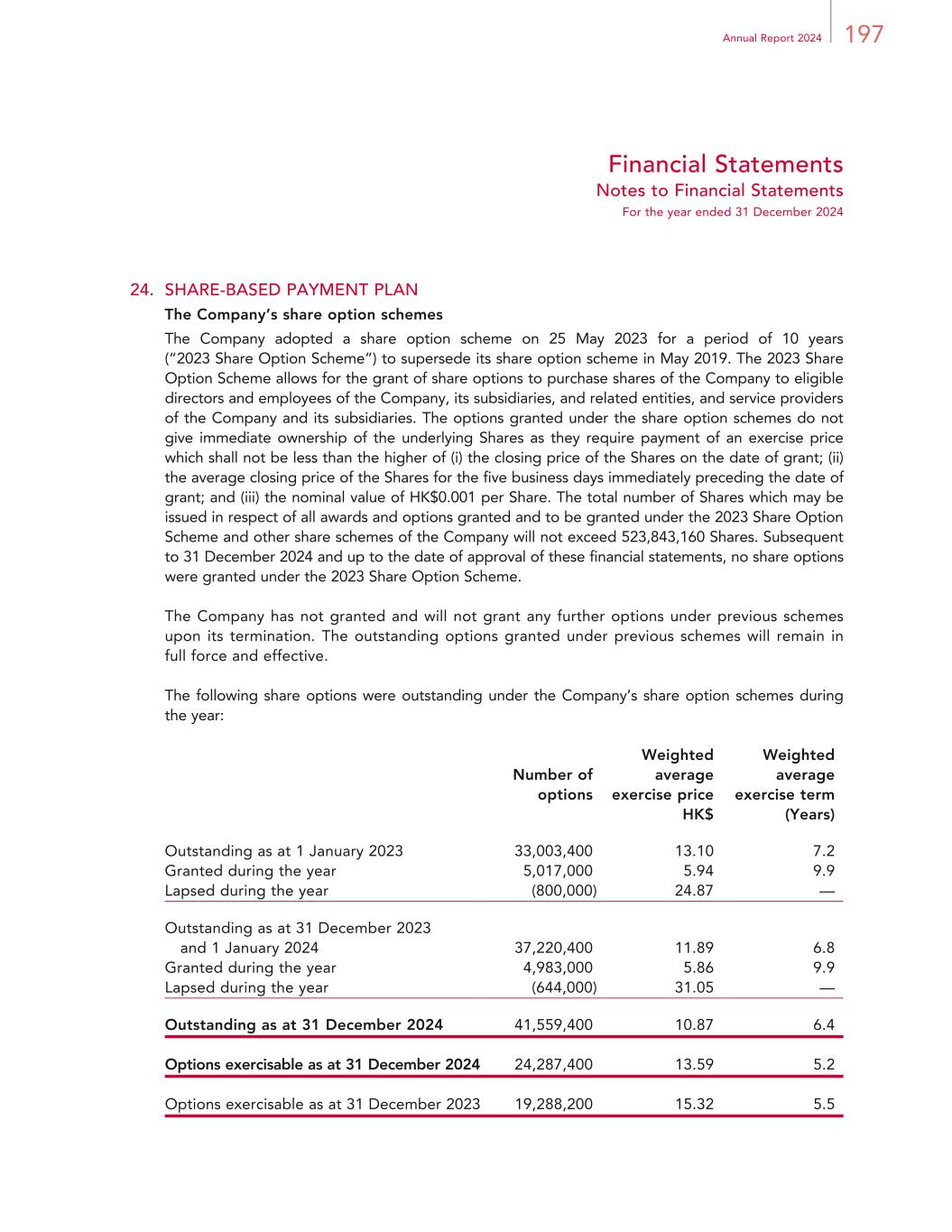 197Annual Report 2024 Financial Statements Notes to Financial Statements For the year ended 31 December 2024 24. SHARE-BASED PAYMENT PLAN The Company’s share option schemes The Company adopted a share option scheme on 25 May 2023 for a period of 10 years (“2023 Share Option Scheme”) to supersede its share option scheme in May 2019. The 2023 Share Option Scheme allows for the grant of share options to purchase shares of the Company to eligible directors and employees of the Company, its subsidiaries, and related entities, and service providers of the Company and its subsidiaries. The options granted under the share option schemes do not give immediate ownership of the underlying Shares as they require payment of an exercise price which shall not be less than the higher of (i) the closing price of the Shares on the date of grant; (ii) the average closing price of the Shares for the five business days immediately preceding the date of grant; and (iii) the nominal value of HK$0.001 per Share. The total number of Shares which may be issued in respect of all awards and options granted and to be granted under the 2023 Share Option Scheme and other share schemes of the Company will not exceed 523,843,160 Shares. Subsequent to 31 December 2024 and up to the date of approval of these financial statements, no share options were granted under the 2023 Share Option Scheme. The Company has not granted and will not grant any further options under previous schemes upon its termination. The outstanding options granted under previous schemes will remain in full force and effective. The following share options were outstanding under the Company’s share option schemes during the year: Number of options Weighted average exercise price Weighted average exercise term HK$ (Years) Outstanding as at 1 January 2023 33,003,400 13.10 7.2 Granted during the year 5,017,000 5.94 9.9 Lapsed during the year (800,000) 24.87 — Outstanding as at 31 December 2023 and 1 January 2024 37,220,400 11.89 6.8 Granted during the year 4,983,000 5.86 9.9 Lapsed during the year (644,000) 31.05 — Outstanding as at 31 December 2024 41,559,400 10.87 6.4 Options exercisable as at 31 December 2024 24,287,400 13.59 5.2 Options exercisable as at 31 December 2023 19,288,200 15.32 5.5