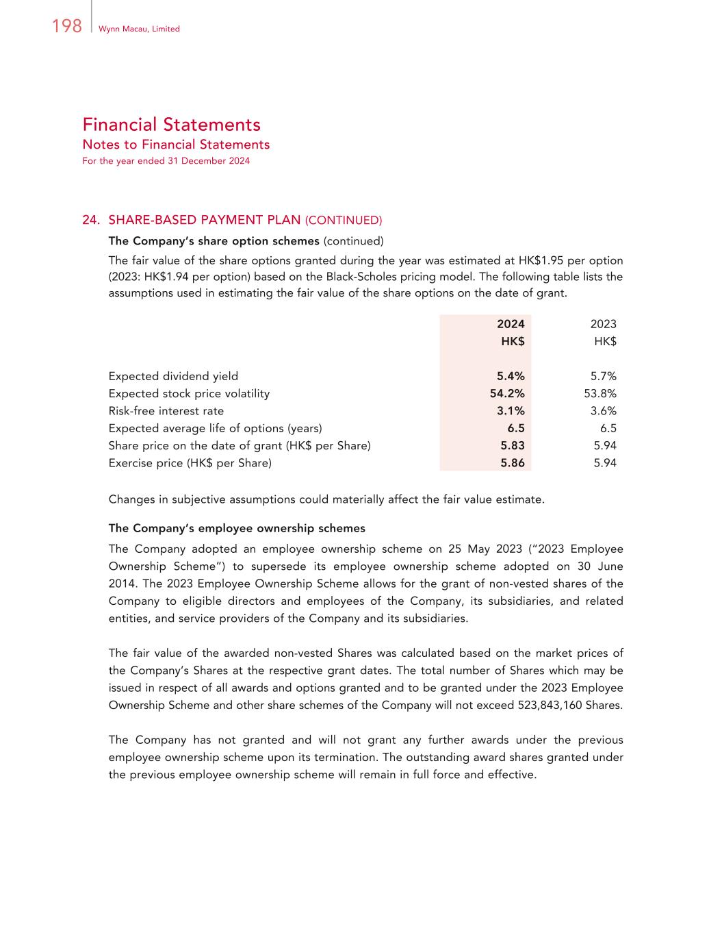 198 Wynn Macau, Limited Financial Statements Notes to Financial Statements For the year ended 31 December 2024 24. SHARE-BASED PAYMENT PLAN (CONTINUED) The Company’s share option schemes (continued) The fair value of the share options granted during the year was estimated at HK$1.95 per option (2023: HK$1.94 per option) based on the Black-Scholes pricing model. The following table lists the assumptions used in estimating the fair value of the share options on the date of grant. 2024 2023 HK$ HK$ Expected dividend yield 5.4% 5.7% Expected stock price volatility 54.2% 53.8% Risk-free interest rate 3.1% 3.6% Expected average life of options (years) 6.5 6.5 Share price on the date of grant (HK$ per Share) 5.83 5.94 Exercise price (HK$ per Share) 5.86 5.94 Changes in subjective assumptions could materially affect the fair value estimate. The Company’s employee ownership schemes The Company adopted an employee ownership scheme on 25 May 2023 (“2023 Employee Ownership Scheme”) to supersede its employee ownership scheme adopted on 30 June 2014. The 2023 Employee Ownership Scheme allows for the grant of non-vested shares of the Company to eligible directors and employees of the Company, its subsidiaries, and related entities, and service providers of the Company and its subsidiaries. The fair value of the awarded non-vested Shares was calculated based on the market prices of the Company’s Shares at the respective grant dates. The total number of Shares which may be issued in respect of all awards and options granted and to be granted under the 2023 Employee Ownership Scheme and other share schemes of the Company will not exceed 523,843,160 Shares. The Company has not granted and will not grant any further awards under the previous employee ownership scheme upon its termination. The outstanding award shares granted under the previous employee ownership scheme will remain in full force and effective.