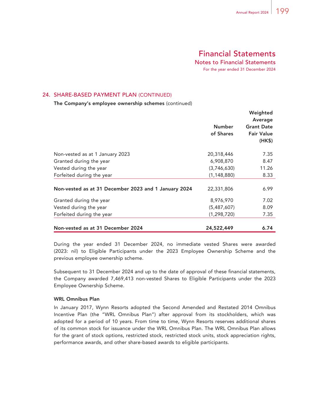 199Annual Report 2024 Financial Statements Notes to Financial Statements For the year ended 31 December 2024 24. SHARE-BASED PAYMENT PLAN (CONTINUED) The Company’s employee ownership schemes (continued) Number of Shares Weighted Average Grant Date Fair Value (HK$) Non-vested as at 1 January 2023 20,318,446 7.35 Granted during the year 6,908,870 8.47 Vested during the year (3,746,630) 11.26 Forfeited during the year (1,148,880) 8.33 Non-vested as at 31 December 2023 and 1 January 2024 22,331,806 6.99 Granted during the year 8,976,970 7.02 Vested during the year (5,487,607) 8.09 Forfeited during the year (1,298,720) 7.35 Non-vested as at 31 December 2024 24,522,449 6.74 During the year ended 31 December 2024, no immediate vested Shares were awarded (2023: nil) to Eligible Participants under the 2023 Employee Ownership Scheme and the previous employee ownership scheme. Subsequent to 31 December 2024 and up to the date of approval of these financial statements, the Company awarded 7,469,413 non-vested Shares to Eligible Participants under the 2023 Employee Ownership Scheme. WRL Omnibus Plan In January 2017, Wynn Resorts adopted the Second Amended and Restated 2014 Omnibus Incentive Plan (the “WRL Omnibus Plan”) after approval from its stockholders, which was adopted for a period of 10 years. From time to time, Wynn Resorts reserves additional shares of its common stock for issuance under the WRL Omnibus Plan. The WRL Omnibus Plan allows for the grant of stock options, restricted stock, restricted stock units, stock appreciation rights, performance awards, and other share-based awards to eligible participants.