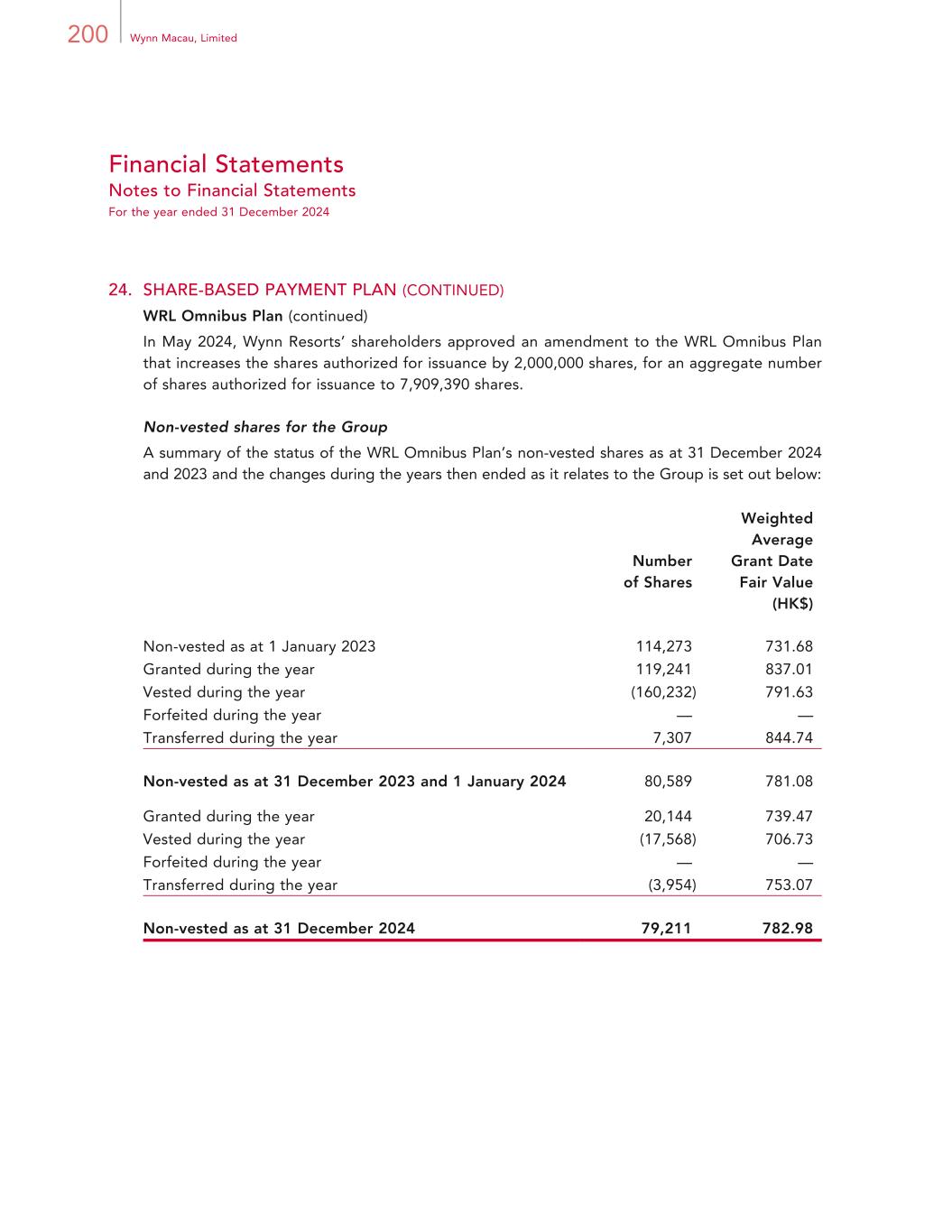 200 Wynn Macau, Limited Financial Statements Notes to Financial Statements For the year ended 31 December 2024 24. SHARE-BASED PAYMENT PLAN (CONTINUED) WRL Omnibus Plan (continued) In May 2024, Wynn Resorts’ shareholders approved an amendment to the WRL Omnibus Plan that increases the shares authorized for issuance by 2,000,000 shares, for an aggregate number of shares authorized for issuance to 7,909,390 shares. Non-vested shares for the Group A summary of the status of the WRL Omnibus Plan’s non-vested shares as at 31 December 2024 and 2023 and the changes during the years then ended as it relates to the Group is set out below: Number of Shares Weighted Average Grant Date Fair Value (HK$) Non-vested as at 1 January 2023 114,273 731.68 Granted during the year 119,241 837.01 Vested during the year (160,232) 791.63 Forfeited during the year — — Transferred during the year 7,307 844.74 Non-vested as at 31 December 2023 and 1 January 2024 80,589 781.08 Granted during the year 20,144 739.47 Vested during the year (17,568) 706.73 Forfeited during the year — — Transferred during the year (3,954) 753.07 Non-vested as at 31 December 2024 79,211 782.98