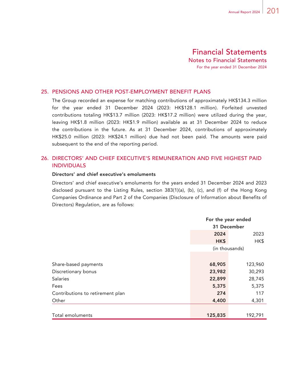 201Annual Report 2024 Financial Statements Notes to Financial Statements For the year ended 31 December 2024 25. PENSIONS AND OTHER POST-EMPLOYMENT BENEFIT PLANS The Group recorded an expense for matching contributions of approximately HK$134.3 million for the year ended 31 December 2024 (2023: HK$128.1 million). Forfeited unvested contributions totaling HK$13.7 million (2023: HK$17.2 million) were utilized during the year, leaving HK$1.8 million (2023: HK$1.9 million) available as at 31 December 2024 to reduce the contributions in the future. As at 31 December 2024, contributions of approximately HK$25.0 million (2023: HK$24.1 million) due had not been paid. The amounts were paid subsequent to the end of the reporting period. 26. DIRECTORS’ AND CHIEF EXECUTIVE’S REMUNERATION AND FIVE HIGHEST PAID INDIVIDUALS Directors’ and chief executive’s emoluments Directors’ and chief executive’s emoluments for the years ended 31 December 2024 and 2023 disclosed pursuant to the Listing Rules, section 383(1)(a), (b), (c), and (f) of the Hong Kong Companies Ordinance and Part 2 of the Companies (Disclosure of Information about Benefits of Directors) Regulation, are as follows: For the year ended 31 December 2024 2023 HK$ HK$ (in thousands) Share-based payments 68,905 123,960 Discretionary bonus 23,982 30,293 Salaries 22,899 28,745 Fees 5,375 5,375 Contributions to retirement plan 274 117 Other 4,400 4,301 Total emoluments 125,835 192,791