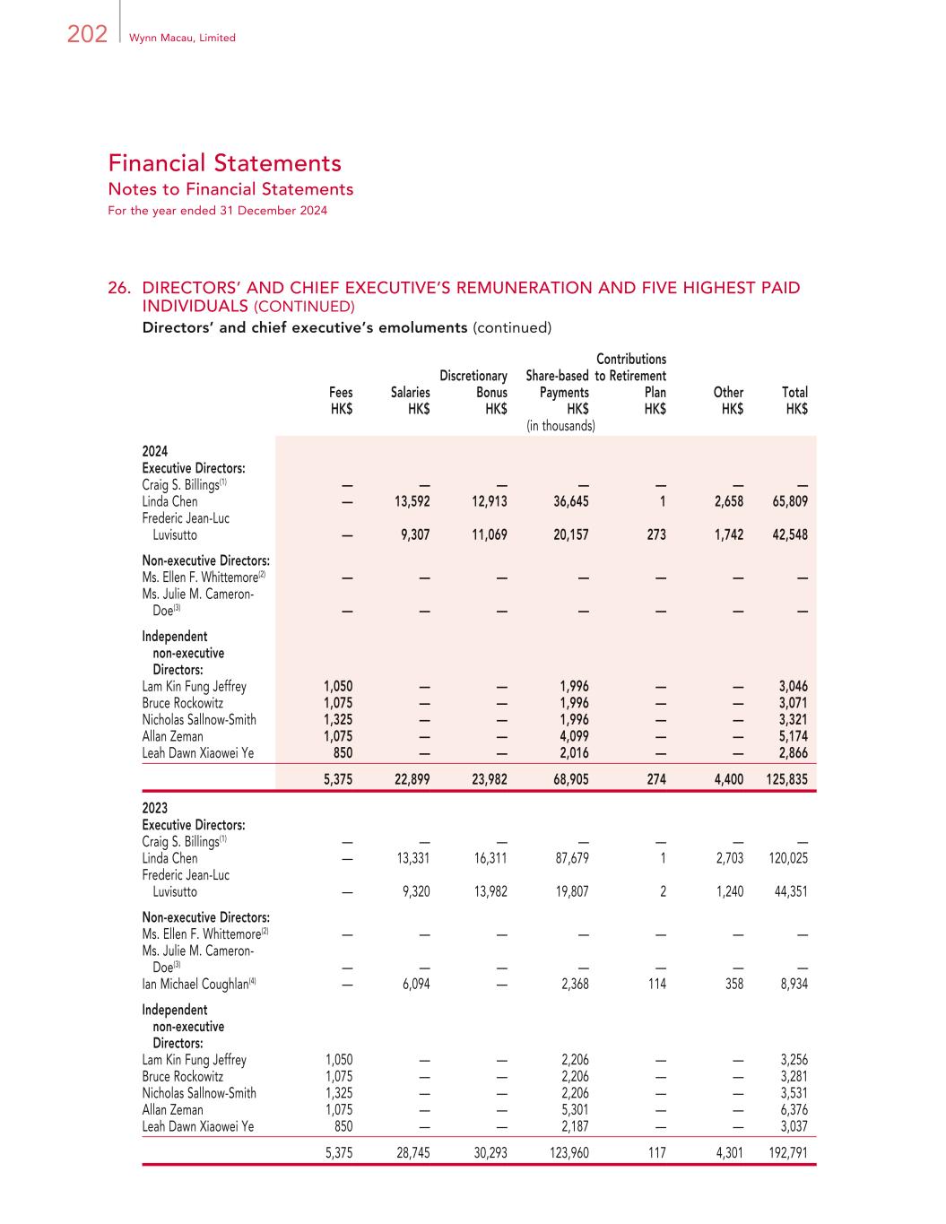 202 Wynn Macau, Limited Financial Statements Notes to Financial Statements For the year ended 31 December 2024 26. DIRECTORS’ AND CHIEF EXECUTIVE’S REMUNERATION AND FIVE HIGHEST PAID INDIVIDUALS (CONTINUED) Directors’ and chief executive’s emoluments (continued) Fees Salaries Discretionary Bonus Share-based Payments Contributions to Retirement Plan Other Total HK$ HK$ HK$ HK$ HK$ HK$ HK$ (in thousands) 2024 Executive Directors: Craig S. Billings(1) — — — — — — — Linda Chen — 13,592 12,913 36,645 1 2,658 65,809 Frederic Jean-Luc Luvisutto — 9,307 11,069 20,157 273 1,742 42,548 Non-executive Directors: Ms. Ellen F. Whittemore(2) — — — — — — — Ms. Julie M. Cameron- Doe(3) — — — — — — — Independent non-executive Directors: Lam Kin Fung Jeffrey 1,050 — — 1,996 — — 3,046 Bruce Rockowitz 1,075 — — 1,996 — — 3,071 Nicholas Sallnow-Smith 1,325 — — 1,996 — — 3,321 Allan Zeman 1,075 — — 4,099 — — 5,174 Leah Dawn Xiaowei Ye 850 — — 2,016 — — 2,866 5,375 22,899 23,982 68,905 274 4,400 125,835 2023 Executive Directors: Craig S. Billings(1) — — — — — — — Linda Chen — 13,331 16,311 87,679 1 2,703 120,025 Frederic Jean-Luc Luvisutto — 9,320 13,982 19,807 2 1,240 44,351 Non-executive Directors: Ms. Ellen F. Whittemore(2) — — — — — — — Ms. Julie M. Cameron- Doe(3) — — — — — — — Ian Michael Coughlan(4) — 6,094 — 2,368 114 358 8,934 Independent non-executive Directors: Lam Kin Fung Jeffrey 1,050 — — 2,206 — — 3,256 Bruce Rockowitz 1,075 — — 2,206 — — 3,281 Nicholas Sallnow-Smith 1,325 — — 2,206 — — 3,531 Allan Zeman 1,075 — — 5,301 — — 6,376 Leah Dawn Xiaowei Ye 850 — — 2,187 — — 3,037 5,375 28,745 30,293 123,960 117 4,301 192,791
