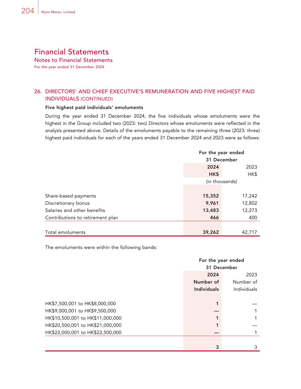 204 Wynn Macau, Limited Financial Statements Notes to Financial Statements For the year ended 31 December 2024 26. DIRECTORS’ AND CHIEF EXECUTIVE’S REMUNERATION AND FIVE HIGHEST PAID INDIVIDUALS (CONTINUED) Five highest paid individuals’ emoluments During the year ended 31 December 2024, the five individuals whose emoluments were the highest in the Group included two (2023: two) Directors whose emoluments were reflected in the analysis presented above. Details of the emoluments payable to the remaining three (2023: three) highest paid individuals for each of the years ended 31 December 2024 and 2023 were as follows: For the year ended 31 December 2024 2023 HK$ HK$ (in thousands) Share-based payments 15,352 17,242 Discretionary bonus 9,961 12,802 Salaries and other benefits 13,483 12,273 Contributions to retirement plan 466 400 Total emoluments 39,262 42,717 The emoluments were within the following bands: For the year ended 31 December 2024 2023 Number of Individuals Number of Individuals HK$7,500,001 to HK$8,000,000 1 — HK$9,000,001 to HK$9,500,000 — 1 HK$10,500,001 to HK$11,000,000 1 1 HK$20,500,001 to HK$21,000,000 1 — HK$22,000,001 to HK$22,500,000 — 1 3 3