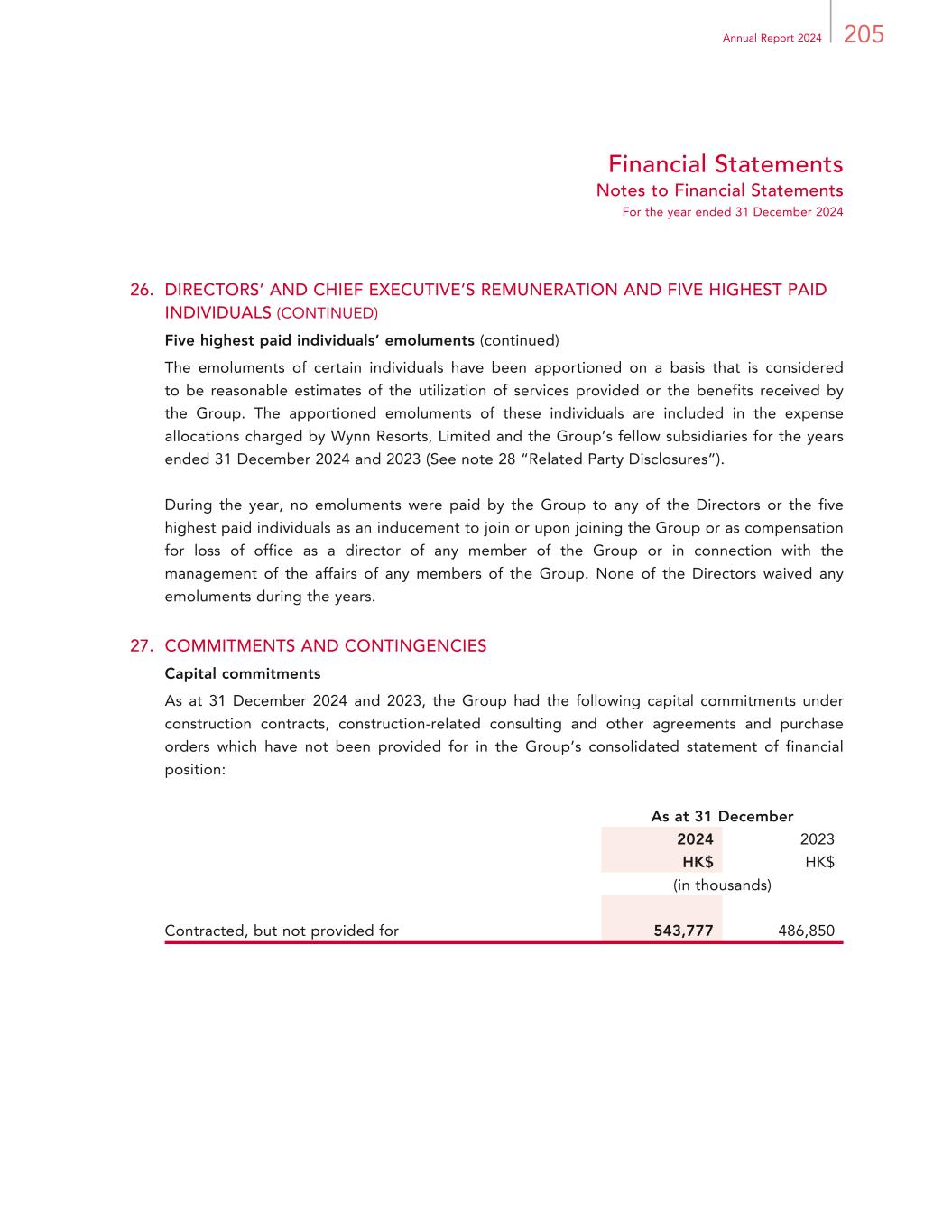 205Annual Report 2024 Financial Statements Notes to Financial Statements For the year ended 31 December 2024 26. DIRECTORS’ AND CHIEF EXECUTIVE’S REMUNERATION AND FIVE HIGHEST PAID INDIVIDUALS (CONTINUED) Five highest paid individuals’ emoluments (continued) The emoluments of certain individuals have been apportioned on a basis that is considered to be reasonable estimates of the utilization of services provided or the benefits received by the Group. The apportioned emoluments of these individuals are included in the expense allocations charged by Wynn Resorts, Limited and the Group’s fellow subsidiaries for the years ended 31 December 2024 and 2023 (See note 28 “Related Party Disclosures”). During the year, no emoluments were paid by the Group to any of the Directors or the five highest paid individuals as an inducement to join or upon joining the Group or as compensation for loss of office as a director of any member of the Group or in connection with the management of the affairs of any members of the Group. None of the Directors waived any emoluments during the years. 27. COMMITMENTS AND CONTINGENCIES Capital commitments As at 31 December 2024 and 2023, the Group had the following capital commitments under construction contracts, construction-related consulting and other agreements and purchase orders which have not been provided for in the Group’s consolidated statement of financial position: As at 31 December 2024 2023 HK$ HK$ (in thousands) Contracted, but not provided for 543,777 486,850