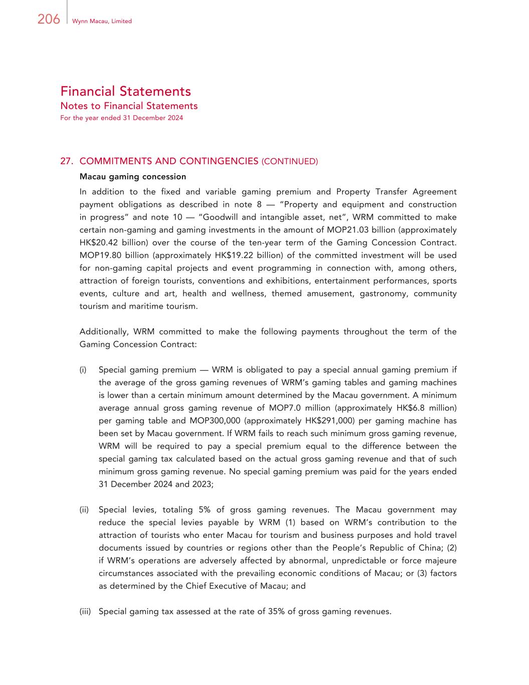 206 Wynn Macau, Limited Financial Statements Notes to Financial Statements For the year ended 31 December 2024 27. COMMITMENTS AND CONTINGENCIES (CONTINUED) Macau gaming concession In addition to the fixed and variable gaming premium and Property Transfer Agreement payment obligations as described in note 8 — “Property and equipment and construction in progress” and note 10 — “Goodwill and intangible asset, net”, WRM committed to make certain non-gaming and gaming investments in the amount of MOP21.03 billion (approximately HK$20.42 billion) over the course of the ten-year term of the Gaming Concession Contract. MOP19.80 billion (approximately HK$19.22 billion) of the committed investment will be used for non-gaming capital projects and event programming in connection with, among others, attraction of foreign tourists, conventions and exhibitions, entertainment performances, sports events, culture and art, health and wellness, themed amusement, gastronomy, community tourism and maritime tourism. Additionally, WRM committed to make the following payments throughout the term of the Gaming Concession Contract: (i) Special gaming premium — WRM is obligated to pay a special annual gaming premium if the average of the gross gaming revenues of WRM’s gaming tables and gaming machines is lower than a certain minimum amount determined by the Macau government. A minimum average annual gross gaming revenue of MOP7.0 million (approximately HK$6.8 million) per gaming table and MOP300,000 (approximately HK$291,000) per gaming machine has been set by Macau government. If WRM fails to reach such minimum gross gaming revenue, WRM will be required to pay a special premium equal to the difference between the special gaming tax calculated based on the actual gross gaming revenue and that of such minimum gross gaming revenue. No special gaming premium was paid for the years ended 31 December 2024 and 2023; (ii) Special levies, totaling 5% of gross gaming revenues. The Macau government may reduce the special levies payable by WRM (1) based on WRM’s contribution to the attraction of tourists who enter Macau for tourism and business purposes and hold travel documents issued by countries or regions other than the People’s Republic of China; (2) if WRM’s operations are adversely affected by abnormal, unpredictable or force majeure circumstances associated with the prevailing economic conditions of Macau; or (3) factors as determined by the Chief Executive of Macau; and (iii) Special gaming tax assessed at the rate of 35% of gross gaming revenues.