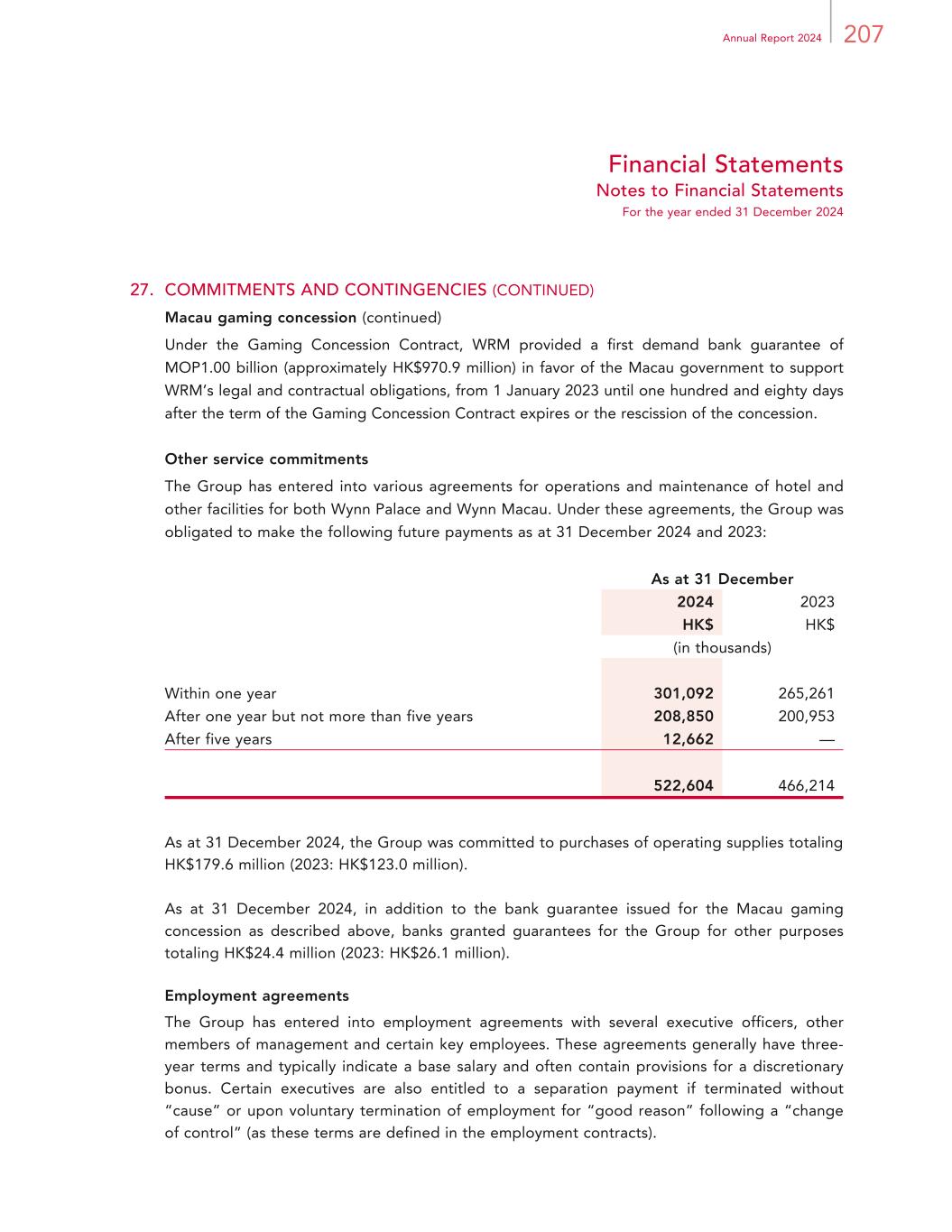 207Annual Report 2024 Financial Statements Notes to Financial Statements For the year ended 31 December 2024 27. COMMITMENTS AND CONTINGENCIES (CONTINUED) Macau gaming concession (continued) Under the Gaming Concession Contract, WRM provided a first demand bank guarantee of MOP1.00 billion (approximately HK$970.9 million) in favor of the Macau government to support WRM’s legal and contractual obligations, from 1 January 2023 until one hundred and eighty days after the term of the Gaming Concession Contract expires or the rescission of the concession. Other service commitments The Group has entered into various agreements for operations and maintenance of hotel and other facilities for both Wynn Palace and Wynn Macau. Under these agreements, the Group was obligated to make the following future payments as at 31 December 2024 and 2023: As at 31 December 2024 2023 HK$ HK$ (in thousands) Within one year 301,092 265,261 After one year but not more than five years 208,850 200,953 After five years 12,662 — 522,604 466,214 As at 31 December 2024, the Group was committed to purchases of operating supplies totaling HK$179.6 million (2023: HK$123.0 million). As at 31 December 2024, in addition to the bank guarantee issued for the Macau gaming concession as described above, banks granted guarantees for the Group for other purposes totaling HK$24.4 million (2023: HK$26.1 million). Employment agreements The Group has entered into employment agreements with several executive officers, other members of management and certain key employees. These agreements generally have three- year terms and typically indicate a base salary and often contain provisions for a discretionary bonus. Certain executives are also entitled to a separation payment if terminated without “cause” or upon voluntary termination of employment for “good reason” following a “change of control” (as these terms are defined in the employment contracts).