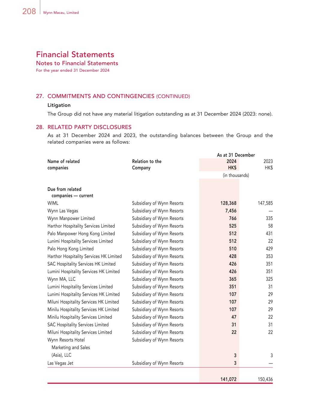 208 Wynn Macau, Limited Financial Statements Notes to Financial Statements For the year ended 31 December 2024 27. COMMITMENTS AND CONTINGENCIES (CONTINUED) Litigation The Group did not have any material litigation outstanding as at 31 December 2024 (2023: none). 28. RELATED PARTY DISCLOSURES As at 31 December 2024 and 2023, the outstanding balances between the Group and the related companies were as follows: As at 31 December Name of related companies Relation to the Company 2024 2023 HK$ HK$ (in thousands) Due from related companies — current WIML Subsidiary of Wynn Resorts 128,368 147,585 Wynn Las Vegas Subsidiary of Wynn Resorts 7,456 — Wynn Manpower Limited Subsidiary of Wynn Resorts 766 335 Harthor Hospitality Services Limited Subsidiary of Wynn Resorts 525 58 Palo Manpower Hong Kong Limited Subsidiary of Wynn Resorts 512 431 Lunimi Hospitality Services Limited Subsidiary of Wynn Resorts 512 22 Palo Hong Kong Limited Subsidiary of Wynn Resorts 510 429 Harthor Hospitality Services HK Limited Subsidiary of Wynn Resorts 428 353 SAC Hospitality Services HK Limited Subsidiary of Wynn Resorts 426 351 Lumini Hospitality Services HK Limited Subsidiary of Wynn Resorts 426 351 Wynn MA, LLC Subsidiary of Wynn Resorts 365 325 Lumini Hospitality Services Limited Subsidiary of Wynn Resorts 351 31 Lunimi Hospitality Services HK Limited Subsidiary of Wynn Resorts 107 29 Miluni Hospitality Services HK Limited Subsidiary of Wynn Resorts 107 29 Minilu Hospitality Services HK Limited Subsidiary of Wynn Resorts 107 29 Minilu Hospitality Services Limited Subsidiary of Wynn Resorts 47 22 SAC Hospitality Services Limited Subsidiary of Wynn Resorts 31 31 Miluni Hospitality Services Limited Subsidiary of Wynn Resorts 22 22 Wynn Resorts Hotel Marketing and Sales (Asia), LLC Subsidiary of Wynn Resorts 3 3 Las Vegas Jet Subsidiary of Wynn Resorts 3 — 141,072 150,436