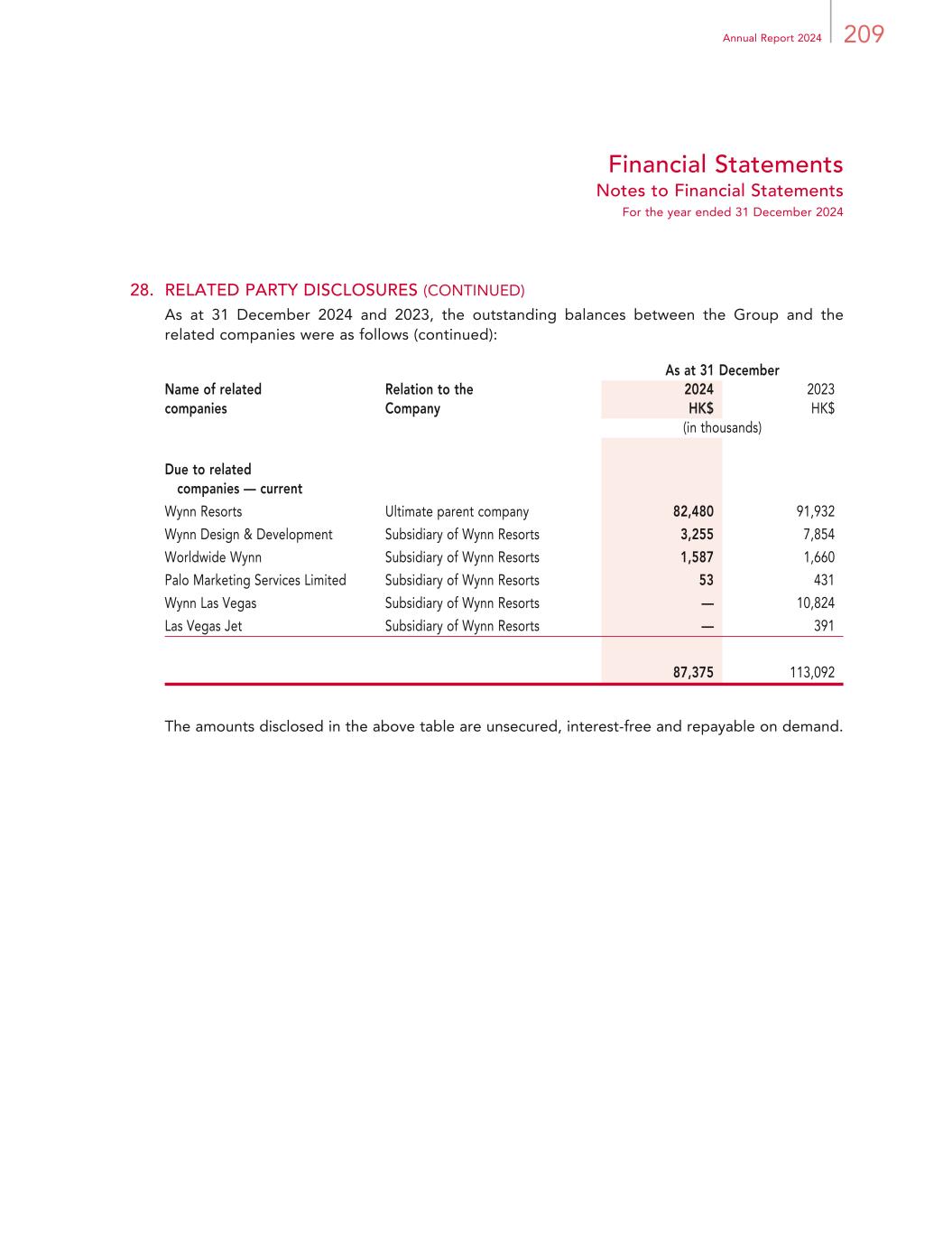 209Annual Report 2024 Financial Statements Notes to Financial Statements For the year ended 31 December 2024 28. RELATED PARTY DISCLOSURES (CONTINUED) As at 31 December 2024 and 2023, the outstanding balances between the Group and the related companies were as follows (continued): As at 31 December Name of related companies Relation to the Company 2024 2023 HK$ HK$ (in thousands) Due to related companies — current Wynn Resorts Ultimate parent company 82,480 91,932 Wynn Design & Development Subsidiary of Wynn Resorts 3,255 7,854 Worldwide Wynn Subsidiary of Wynn Resorts 1,587 1,660 Palo Marketing Services Limited Subsidiary of Wynn Resorts 53 431 Wynn Las Vegas Subsidiary of Wynn Resorts — 10,824 Las Vegas Jet Subsidiary of Wynn Resorts — 391 87,375 113,092 The amounts disclosed in the above table are unsecured, interest-free and repayable on demand.