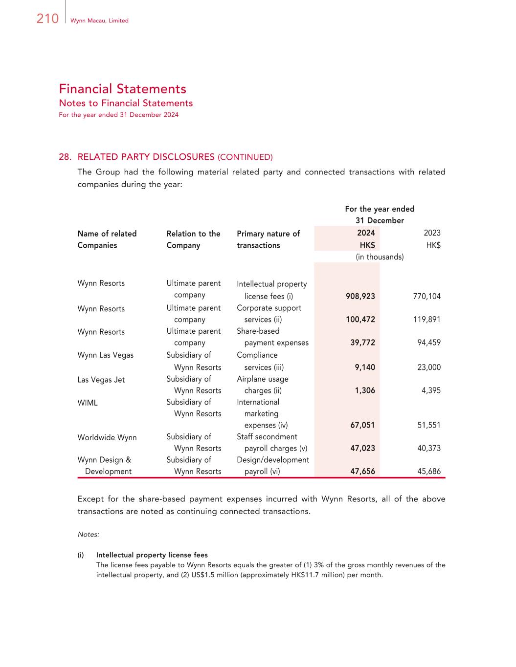 210 Wynn Macau, Limited Financial Statements Notes to Financial Statements For the year ended 31 December 2024 28. RELATED PARTY DISCLOSURES (CONTINUED) The Group had the following material related party and connected transactions with related companies during the year: For the year ended 31 December Name of related Companies Relation to the Company Primary nature of transactions 2024 2023 HK$ HK$ (in thousands) Wynn Resorts Ultimate parent company Intellectual property license fees (i) 908,923 770,104 Wynn Resorts Ultimate parent company Corporate support services (ii) 100,472 119,891 Wynn Resorts Ultimate parent company Share-based payment expenses 39,772 94,459 Wynn Las Vegas Subsidiary of Wynn Resorts Compliance services (iii) 9,140 23,000 Las Vegas Jet Subsidiary of Wynn Resorts Airplane usage charges (ii) 1,306 4,395 WIML Subsidiary of Wynn Resorts International marketing expenses (iv) 67,051 51,551 Worldwide Wynn Subsidiary of Wynn Resorts Staff secondment payroll charges (v) 47,023 40,373 Wynn Design & Development Subsidiary of Wynn Resorts Design/development payroll (vi) 47,656 45,686 Except for the share-based payment expenses incurred with Wynn Resorts, all of the above transactions are noted as continuing connected transactions. Notes: (i) Intellectual property license fees The license fees payable to Wynn Resorts equals the greater of (1) 3% of the gross monthly revenues of the intellectual property, and (2) US$1.5 million (approximately HK$11.7 million) per month.