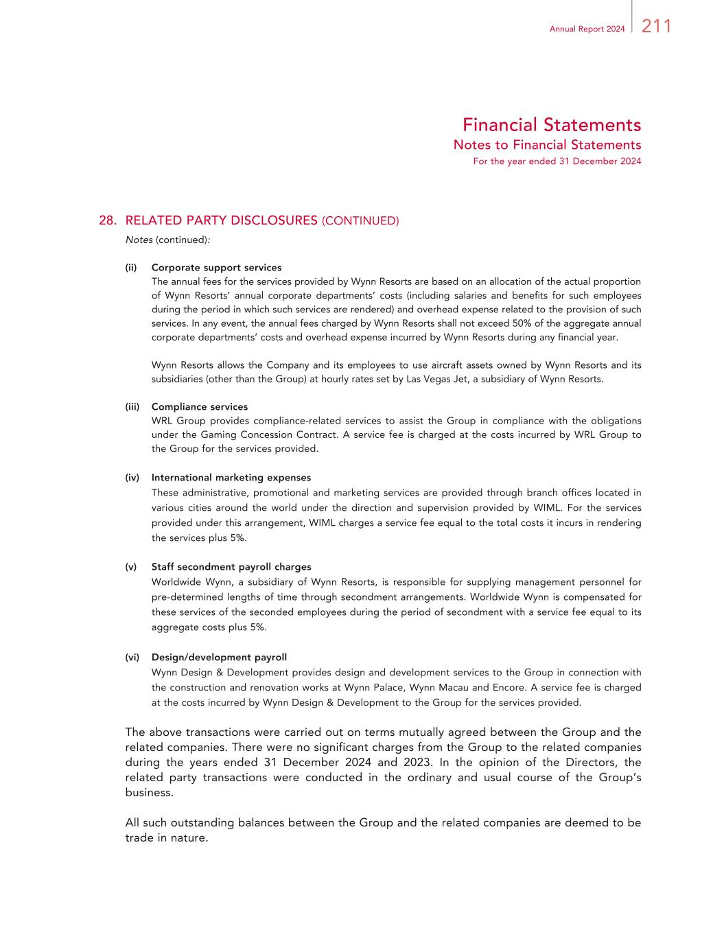 211Annual Report 2024 Financial Statements Notes to Financial Statements For the year ended 31 December 2024 28. RELATED PARTY DISCLOSURES (CONTINUED) Notes (continued): (ii) Corporate support services The annual fees for the services provided by Wynn Resorts are based on an allocation of the actual proportion of Wynn Resorts’ annual corporate departments’ costs (including salaries and benefits for such employees during the period in which such services are rendered) and overhead expense related to the provision of such services. In any event, the annual fees charged by Wynn Resorts shall not exceed 50% of the aggregate annual corporate departments’ costs and overhead expense incurred by Wynn Resorts during any financial year. Wynn Resorts allows the Company and its employees to use aircraft assets owned by Wynn Resorts and its subsidiaries (other than the Group) at hourly rates set by Las Vegas Jet, a subsidiary of Wynn Resorts. (iii) Compliance services WRL Group provides compliance-related services to assist the Group in compliance with the obligations under the Gaming Concession Contract. A service fee is charged at the costs incurred by WRL Group to the Group for the services provided. (iv) International marketing expenses These administrative, promotional and marketing services are provided through branch offices located in various cities around the world under the direction and supervision provided by WIML. For the services provided under this arrangement, WIML charges a service fee equal to the total costs it incurs in rendering the services plus 5%. (v) Staff secondment payroll charges Worldwide Wynn, a subsidiary of Wynn Resorts, is responsible for supplying management personnel for pre-determined lengths of time through secondment arrangements. Worldwide Wynn is compensated for these services of the seconded employees during the period of secondment with a service fee equal to its aggregate costs plus 5%. (vi) Design/development payroll Wynn Design & Development provides design and development services to the Group in connection with the construction and renovation works at Wynn Palace, Wynn Macau and Encore. A service fee is charged at the costs incurred by Wynn Design & Development to the Group for the services provided. The above transactions were carried out on terms mutually agreed between the Group and the related companies. There were no significant charges from the Group to the related companies during the years ended 31 December 2024 and 2023. In the opinion of the Directors, the related party transactions were conducted in the ordinary and usual course of the Group’s business. All such outstanding balances between the Group and the related companies are deemed to be trade in nature.