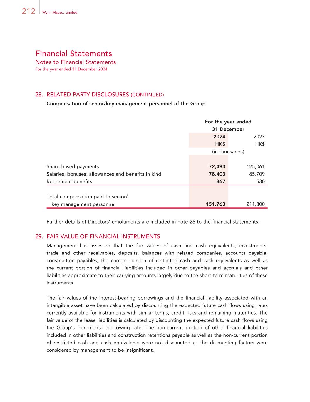 212 Wynn Macau, Limited Financial Statements Notes to Financial Statements For the year ended 31 December 2024 28. RELATED PARTY DISCLOSURES (CONTINUED) Compensation of senior/key management personnel of the Group For the year ended 31 December 2024 2023 HK$ HK$ (in thousands) Share-based payments 72,493 125,061 Salaries, bonuses, allowances and benefits in kind 78,403 85,709 Retirement benefits 867 530 Total compensation paid to senior/ key management personnel 151,763 211,300 Further details of Directors’ emoluments are included in note 26 to the financial statements. 29. FAIR VALUE OF FINANCIAL INSTRUMENTS Management has assessed that the fair values of cash and cash equivalents, investments, trade and other receivables, deposits, balances with related companies, accounts payable, construction payables, the current portion of restricted cash and cash equivalents as well as the current portion of financial liabilities included in other payables and accruals and other liabilities approximate to their carrying amounts largely due to the short-term maturities of these instruments. The fair values of the interest-bearing borrowings and the financial liability associated with an intangible asset have been calculated by discounting the expected future cash flows using rates currently available for instruments with similar terms, credit risks and remaining maturities. The fair value of the lease liabilities is calculated by discounting the expected future cash flows using the Group’s incremental borrowing rate. The non-current portion of other financial liabilities included in other liabilities and construction retentions payable as well as the non-current portion of restricted cash and cash equivalents were not discounted as the discounting factors were considered by management to be insignificant.