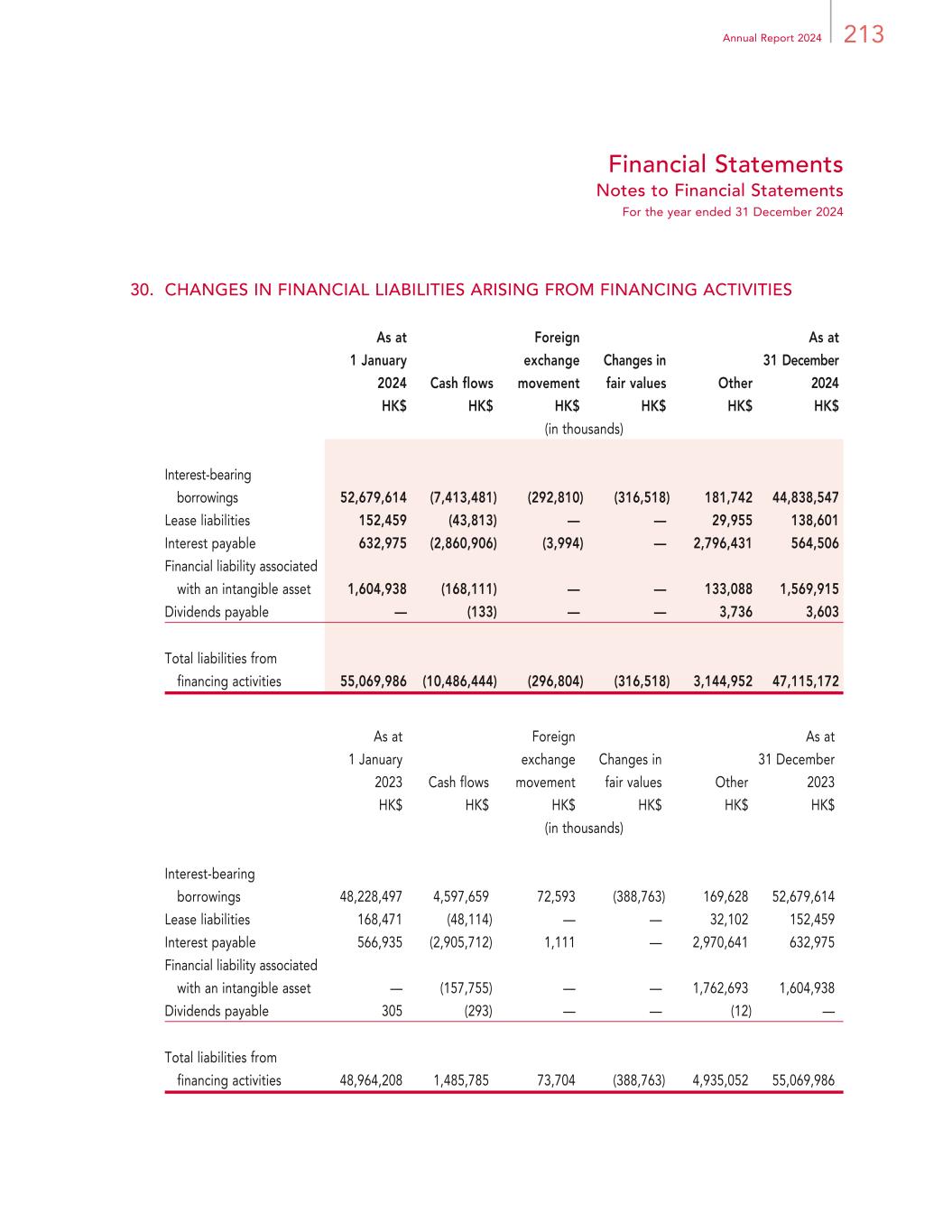 213Annual Report 2024 Financial Statements Notes to Financial Statements For the year ended 31 December 2024 30. CHANGES IN FINANCIAL LIABILITIES ARISING FROM FINANCING ACTIVITIES As at 1 January 2024 Cash flows Foreign exchange movement Changes in fair values Other As at 31 December 2024 HK$ HK$ HK$ HK$ HK$ HK$ (in thousands) Interest-bearing borrowings 52,679,614 (7,413,481) (292,810) (316,518) 181,742 44,838,547 Lease liabilities 152,459 (43,813) — — 29,955 138,601 Interest payable 632,975 (2,860,906) (3,994) — 2,796,431 564,506 Financial liability associated with an intangible asset 1,604,938 (168,111) — — 133,088 1,569,915 Dividends payable — (133) — — 3,736 3,603 Total liabilities from financing activities 55,069,986 (10,486,444) (296,804) (316,518) 3,144,952 47,115,172 As at 1 January 2023 Cash flows Foreign exchange movement Changes in fair values Other As at 31 December 2023 HK$ HK$ HK$ HK$ HK$ HK$ (in thousands) Interest-bearing borrowings 48,228,497 4,597,659 72,593 (388,763) 169,628 52,679,614 Lease liabilities 168,471 (48,114) — — 32,102 152,459 Interest payable 566,935 (2,905,712) 1,111 — 2,970,641 632,975 Financial liability associated with an intangible asset — (157,755) — — 1,762,693 1,604,938 Dividends payable 305 (293) — — (12) — Total liabilities from financing activities 48,964,208 1,485,785 73,704 (388,763) 4,935,052 55,069,986