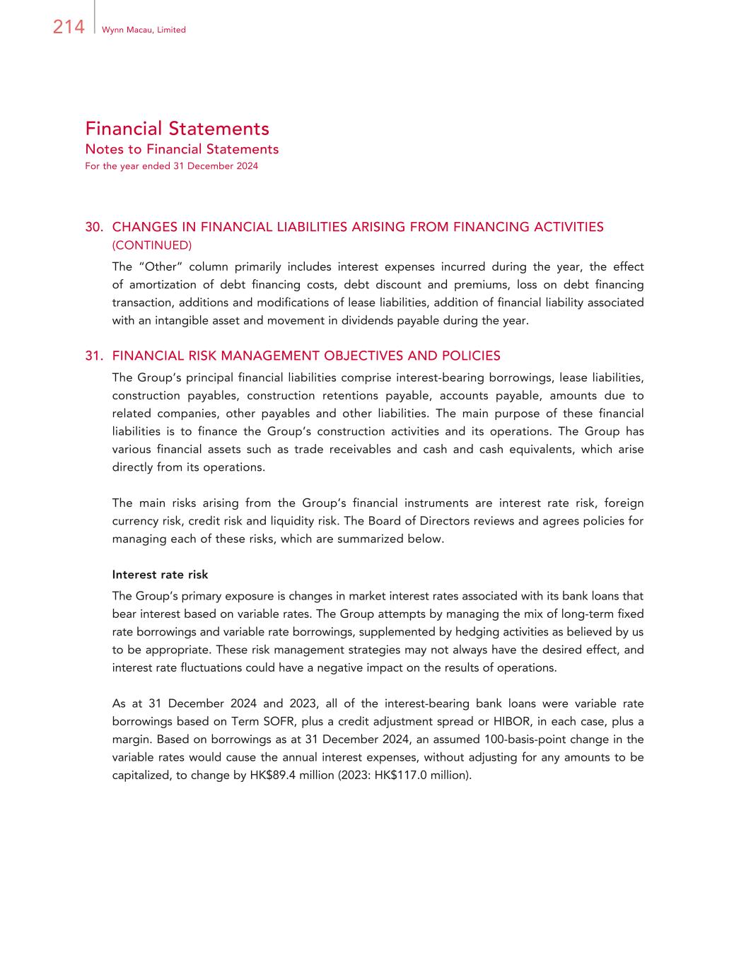 214 Wynn Macau, Limited Financial Statements Notes to Financial Statements For the year ended 31 December 2024 30. CHANGES IN FINANCIAL LIABILITIES ARISING FROM FINANCING ACTIVITIES (CONTINUED) The “Other” column primarily includes interest expenses incurred during the year, the effect of amortization of debt financing costs, debt discount and premiums, loss on debt financing transaction, additions and modifications of lease liabilities, addition of financial liability associated with an intangible asset and movement in dividends payable during the year. 31. FINANCIAL RISK MANAGEMENT OBJECTIVES AND POLICIES The Group’s principal financial liabilities comprise interest-bearing borrowings, lease liabilities, construction payables, construction retentions payable, accounts payable, amounts due to related companies, other payables and other liabilities. The main purpose of these financial liabilities is to finance the Group’s construction activities and its operations. The Group has various financial assets such as trade receivables and cash and cash equivalents, which arise directly from its operations. The main risks arising from the Group’s financial instruments are interest rate risk, foreign currency risk, credit risk and liquidity risk. The Board of Directors reviews and agrees policies for managing each of these risks, which are summarized below. Interest rate risk The Group’s primary exposure is changes in market interest rates associated with its bank loans that bear interest based on variable rates. The Group attempts by managing the mix of long-term fixed rate borrowings and variable rate borrowings, supplemented by hedging activities as believed by us to be appropriate. These risk management strategies may not always have the desired effect, and interest rate fluctuations could have a negative impact on the results of operations. As at 31 December 2024 and 2023, all of the interest-bearing bank loans were variable rate borrowings based on Term SOFR, plus a credit adjustment spread or HIBOR, in each case, plus a margin. Based on borrowings as at 31 December 2024, an assumed 100-basis-point change in the variable rates would cause the annual interest expenses, without adjusting for any amounts to be capitalized, to change by HK$89.4 million (2023: HK$117.0 million).