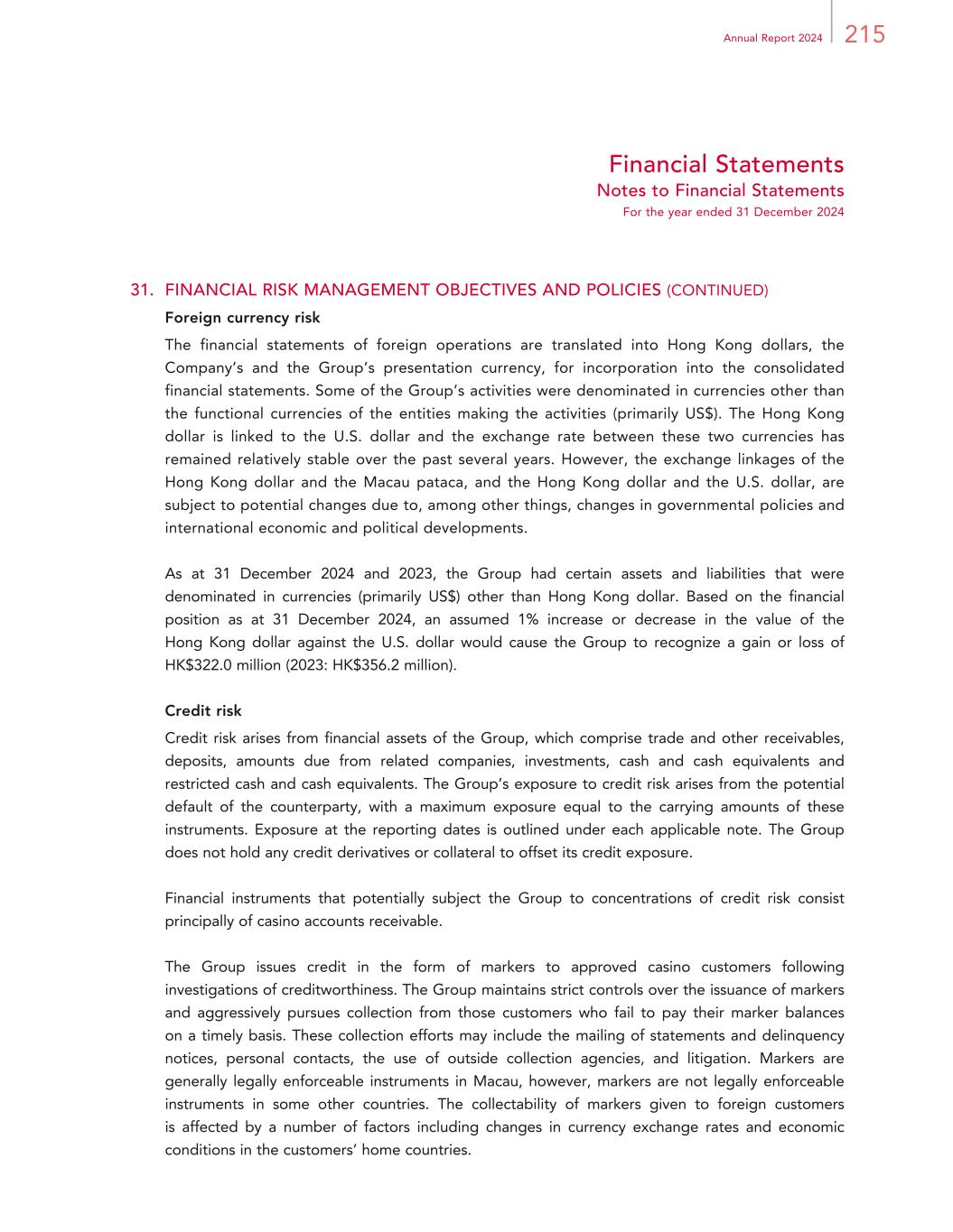 215Annual Report 2024 Financial Statements Notes to Financial Statements For the year ended 31 December 2024 31. FINANCIAL RISK MANAGEMENT OBJECTIVES AND POLICIES (CONTINUED) Foreign currency risk The financial statements of foreign operations are translated into Hong Kong dollars, the Company’s and the Group’s presentation currency, for incorporation into the consolidated financial statements. Some of the Group’s activities were denominated in currencies other than the functional currencies of the entities making the activities (primarily US$). The Hong Kong dollar is linked to the U.S. dollar and the exchange rate between these two currencies has remained relatively stable over the past several years. However, the exchange linkages of the Hong Kong dollar and the Macau pataca, and the Hong Kong dollar and the U.S. dollar, are subject to potential changes due to, among other things, changes in governmental policies and international economic and political developments. As at 31 December 2024 and 2023, the Group had certain assets and liabilities that were denominated in currencies (primarily US$) other than Hong Kong dollar. Based on the financial position as at 31 December 2024, an assumed 1% increase or decrease in the value of the Hong Kong dollar against the U.S. dollar would cause the Group to recognize a gain or loss of HK$322.0 million (2023: HK$356.2 million). Credit risk Credit risk arises from financial assets of the Group, which comprise trade and other receivables, deposits, amounts due from related companies, investments, cash and cash equivalents and restricted cash and cash equivalents. The Group’s exposure to credit risk arises from the potential default of the counterparty, with a maximum exposure equal to the carrying amounts of these instruments. Exposure at the reporting dates is outlined under each applicable note. The Group does not hold any credit derivatives or collateral to offset its credit exposure. Financial instruments that potentially subject the Group to concentrations of credit risk consist principally of casino accounts receivable. The Group issues credit in the form of markers to approved casino customers following investigations of creditworthiness. The Group maintains strict controls over the issuance of markers and aggressively pursues collection from those customers who fail to pay their marker balances on a timely basis. These collection efforts may include the mailing of statements and delinquency notices, personal contacts, the use of outside collection agencies, and litigation. Markers are generally legally enforceable instruments in Macau, however, markers are not legally enforceable instruments in some other countries. The collectability of markers given to foreign customers is affected by a number of factors including changes in currency exchange rates and economic conditions in the customers’ home countries.