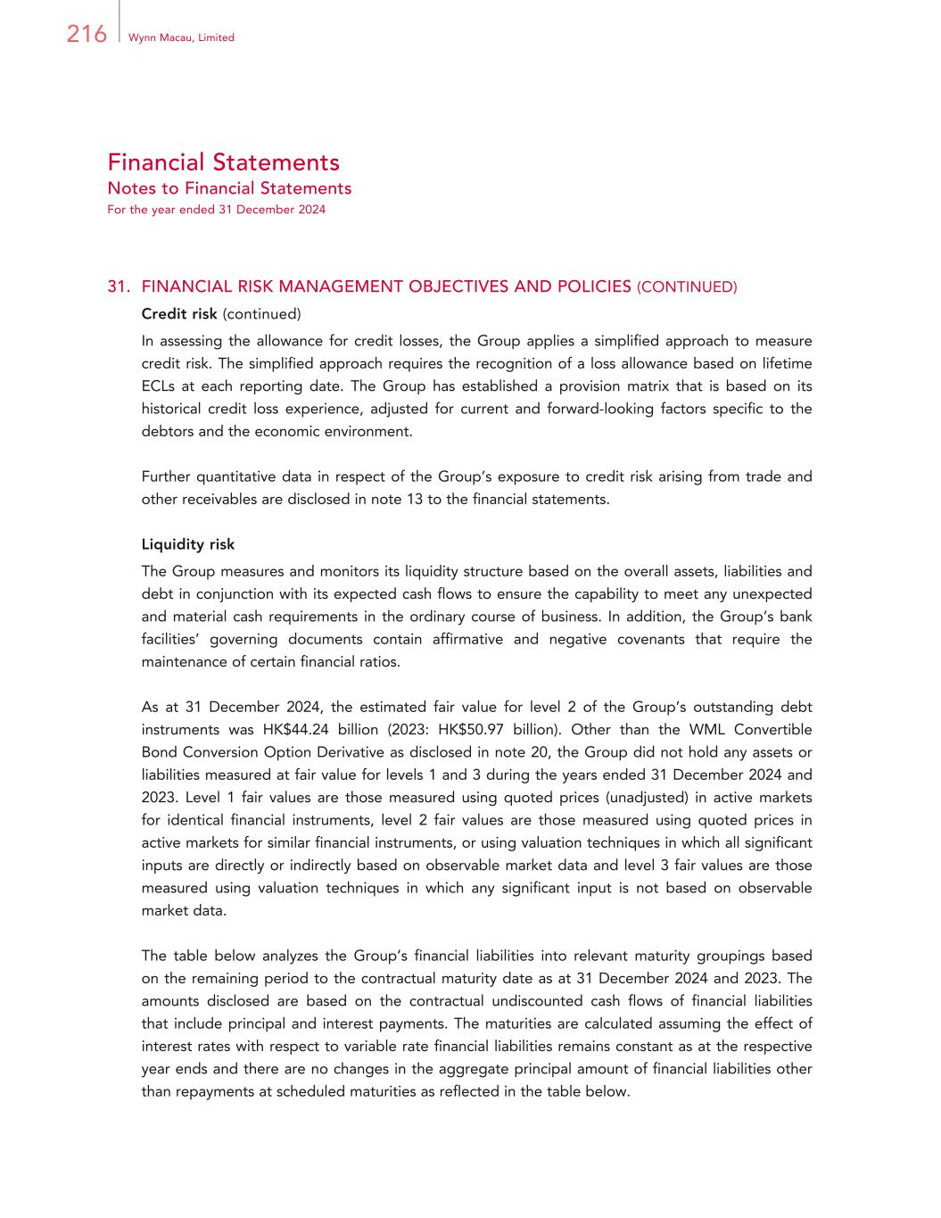 216 Wynn Macau, Limited Financial Statements Notes to Financial Statements For the year ended 31 December 2024 31. FINANCIAL RISK MANAGEMENT OBJECTIVES AND POLICIES (CONTINUED) Credit risk (continued) In assessing the allowance for credit losses, the Group applies a simplified approach to measure credit risk. The simplified approach requires the recognition of a loss allowance based on lifetime ECLs at each reporting date. The Group has established a provision matrix that is based on its historical credit loss experience, adjusted for current and forward-looking factors specific to the debtors and the economic environment. Further quantitative data in respect of the Group’s exposure to credit risk arising from trade and other receivables are disclosed in note 13 to the financial statements. Liquidity risk The Group measures and monitors its liquidity structure based on the overall assets, liabilities and debt in conjunction with its expected cash flows to ensure the capability to meet any unexpected and material cash requirements in the ordinary course of business. In addition, the Group’s bank facilities’ governing documents contain affirmative and negative covenants that require the maintenance of certain financial ratios. As at 31 December 2024, the estimated fair value for level 2 of the Group’s outstanding debt instruments was HK$44.24 billion (2023: HK$50.97 billion). Other than the WML Convertible Bond Conversion Option Derivative as disclosed in note 20, the Group did not hold any assets or liabilities measured at fair value for levels 1 and 3 during the years ended 31 December 2024 and 2023. Level 1 fair values are those measured using quoted prices (unadjusted) in active markets for identical financial instruments, level 2 fair values are those measured using quoted prices in active markets for similar financial instruments, or using valuation techniques in which all significant inputs are directly or indirectly based on observable market data and level 3 fair values are those measured using valuation techniques in which any significant input is not based on observable market data. The table below analyzes the Group’s financial liabilities into relevant maturity groupings based on the remaining period to the contractual maturity date as at 31 December 2024 and 2023. The amounts disclosed are based on the contractual undiscounted cash flows of financial liabilities that include principal and interest payments. The maturities are calculated assuming the effect of interest rates with respect to variable rate financial liabilities remains constant as at the respective year ends and there are no changes in the aggregate principal amount of financial liabilities other than repayments at scheduled maturities as reflected in the table below.