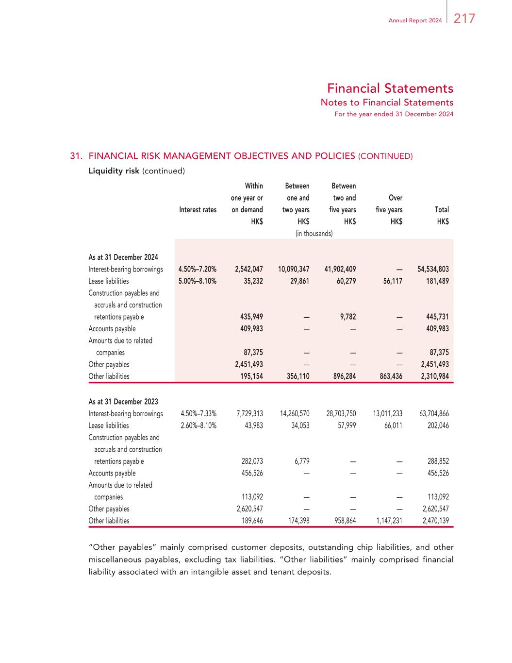 217Annual Report 2024 Financial Statements Notes to Financial Statements For the year ended 31 December 2024 31. FINANCIAL RISK MANAGEMENT OBJECTIVES AND POLICIES (CONTINUED) Liquidity risk (continued) Interest rates Within one year or on demand Between one and two years Between two and five years Over five years Total HK$ HK$ HK$ HK$ HK$ (in thousands) As at 31 December 2024 Interest-bearing borrowings 4.50%–7.20% 2,542,047 10,090,347 41,902,409 — 54,534,803 Lease liabilities 5.00%–8.10% 35,232 29,861 60,279 56,117 181,489 Construction payables and accruals and construction retentions payable 435,949 — 9,782 — 445,731 Accounts payable 409,983 — — — 409,983 Amounts due to related companies 87,375 — — — 87,375 Other payables 2,451,493 — — — 2,451,493 Other liabilities 195,154 356,110 896,284 863,436 2,310,984 As at 31 December 2023 Interest-bearing borrowings 4.50%–7.33% 7,729,313 14,260,570 28,703,750 13,011,233 63,704,866 Lease liabilities 2.60%–8.10% 43,983 34,053 57,999 66,011 202,046 Construction payables and accruals and construction retentions payable 282,073 6,779 — — 288,852 Accounts payable 456,526 — — — 456,526 Amounts due to related companies 113,092 — — — 113,092 Other payables 2,620,547 — — — 2,620,547 Other liabilities 189,646 174,398 958,864 1,147,231 2,470,139 “Other payables” mainly comprised customer deposits, outstanding chip liabilities, and other miscellaneous payables, excluding tax liabilities. “Other liabilities” mainly comprised financial liability associated with an intangible asset and tenant deposits.