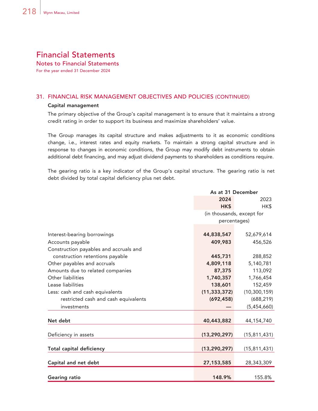 218 Wynn Macau, Limited Financial Statements Notes to Financial Statements For the year ended 31 December 2024 31. FINANCIAL RISK MANAGEMENT OBJECTIVES AND POLICIES (CONTINUED) Capital management The primary objective of the Group’s capital management is to ensure that it maintains a strong credit rating in order to support its business and maximize shareholders’ value. The Group manages its capital structure and makes adjustments to it as economic conditions change, i.e., interest rates and equity markets. To maintain a strong capital structure and in response to changes in economic conditions, the Group may modify debt instruments to obtain additional debt financing, and may adjust dividend payments to shareholders as conditions require. The gearing ratio is a key indicator of the Group’s capital structure. The gearing ratio is net debt divided by total capital deficiency plus net debt. As at 31 December 2024 2023 HK$ HK$ (in thousands, except for percentages) Interest-bearing borrowings 44,838,547 52,679,614 Accounts payable 409,983 456,526 Construction payables and accruals and construction retentions payable 445,731 288,852 Other payables and accruals 4,809,118 5,140,781 Amounts due to related companies 87,375 113,092 Other liabilities 1,740,357 1,766,454 Lease liabilities 138,601 152,459 Less: cash and cash equivalents (11,333,372) (10,300,159) restricted cash and cash equivalents (692,458) (688,219) investments — (5,454,660) Net debt 40,443,882 44,154,740 Deficiency in assets (13,290,297) (15,811,431) Total capital deficiency (13,290,297) (15,811,431) Capital and net debt 27,153,585 28,343,309 Gearing ratio 148.9% 155.8%