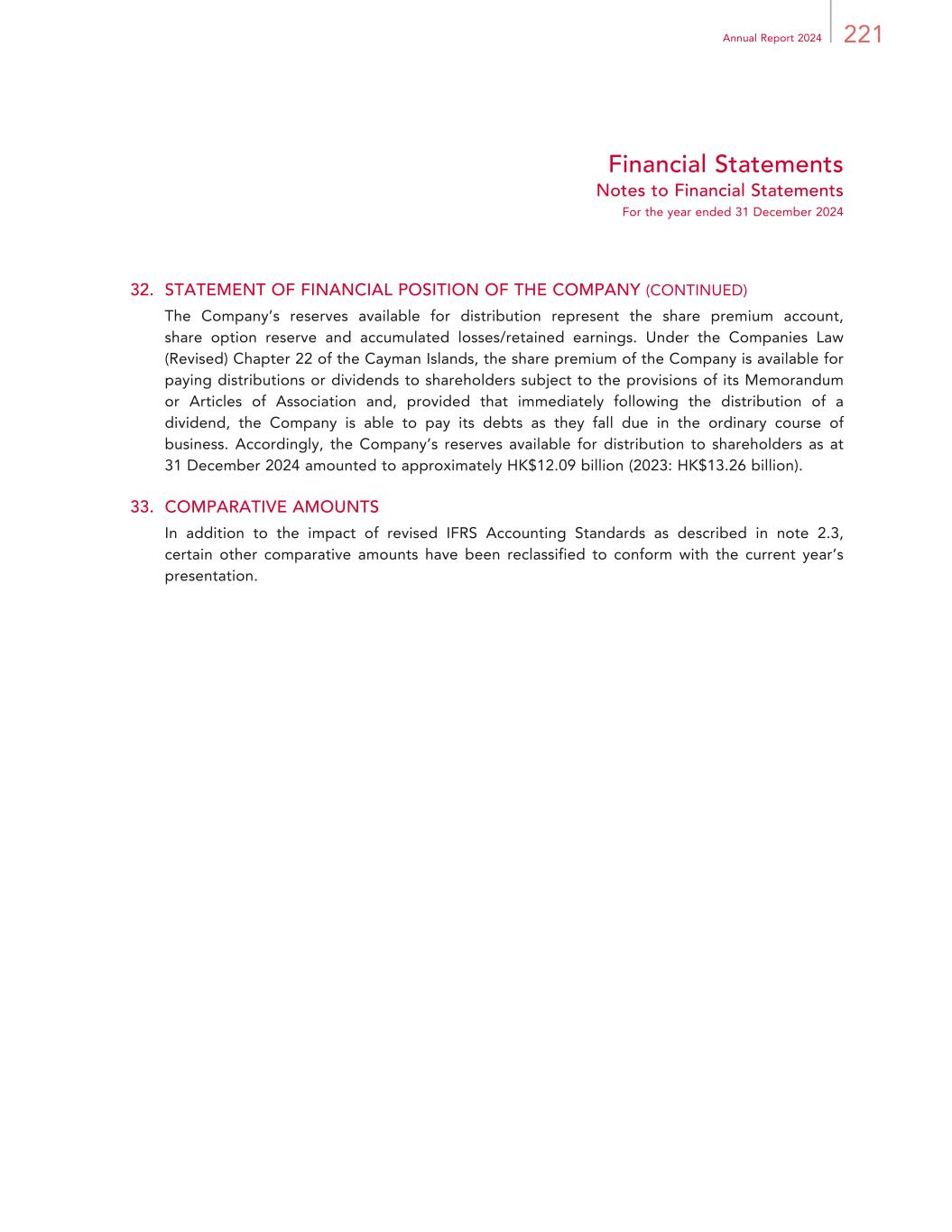 221Annual Report 2024 Financial Statements Notes to Financial Statements For the year ended 31 December 2024 32. STATEMENT OF FINANCIAL POSITION OF THE COMPANY (CONTINUED) The Company’s reserves available for distribution represent the share premium account, share option reserve and accumulated losses/retained earnings. Under the Companies Law (Revised) Chapter 22 of the Cayman Islands, the share premium of the Company is available for paying distributions or dividends to shareholders subject to the provisions of its Memorandum or Articles of Association and, provided that immediately following the distribution of a dividend, the Company is able to pay its debts as they fall due in the ordinary course of business. Accordingly, the Company’s reserves available for distribution to shareholders as at 31 December 2024 amounted to approximately HK$12.09 billion (2023: HK$13.26 billion). 33. COMPARATIVE AMOUNTS In addition to the impact of revised IFRS Accounting Standards as described in note 2.3, certain other comparative amounts have been reclassified to conform with the current year’s presentation.