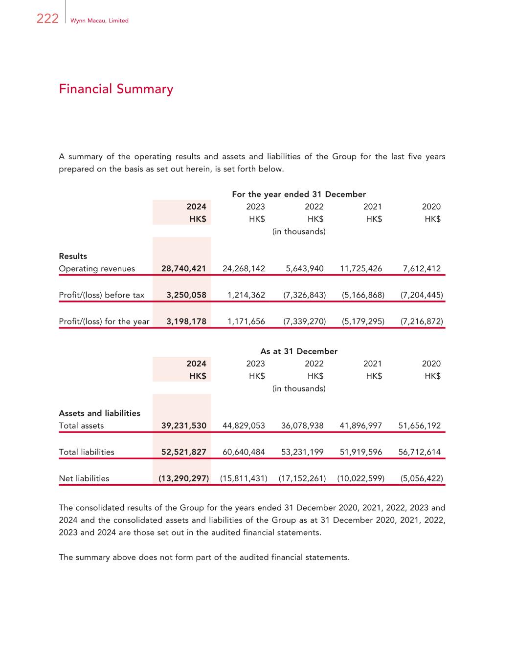 222 Wynn Macau, Limited Financial Summary A summary of the operating results and assets and liabilities of the Group for the last five years prepared on the basis as set out herein, is set forth below. For the year ended 31 December 2024 2023 2022 2021 2020 HK$ HK$ HK$ HK$ HK$ (in thousands) Results Operating revenues 28,740,421 24,268,142 5,643,940 11,725,426 7,612,412 Profit/(loss) before tax 3,250,058 1,214,362 (7,326,843) (5,166,868) (7,204,445) Profit/(loss) for the year 3,198,178 1,171,656 (7,339,270) (5,179,295) (7,216,872) As at 31 December 2024 2023 2022 2021 2020 HK$ HK$ HK$ HK$ HK$ (in thousands) Assets and liabilities Total assets 39,231,530 44,829,053 36,078,938 41,896,997 51,656,192 Total liabilities 52,521,827 60,640,484 53,231,199 51,919,596 56,712,614 Net liabilities (13,290,297) (15,811,431) (17,152,261) (10,022,599) (5,056,422) The consolidated results of the Group for the years ended 31 December 2020, 2021, 2022, 2023 and 2024 and the consolidated assets and liabilities of the Group as at 31 December 2020, 2021, 2022, 2023 and 2024 are those set out in the audited financial statements. The summary above does not form part of the audited financial statements.
