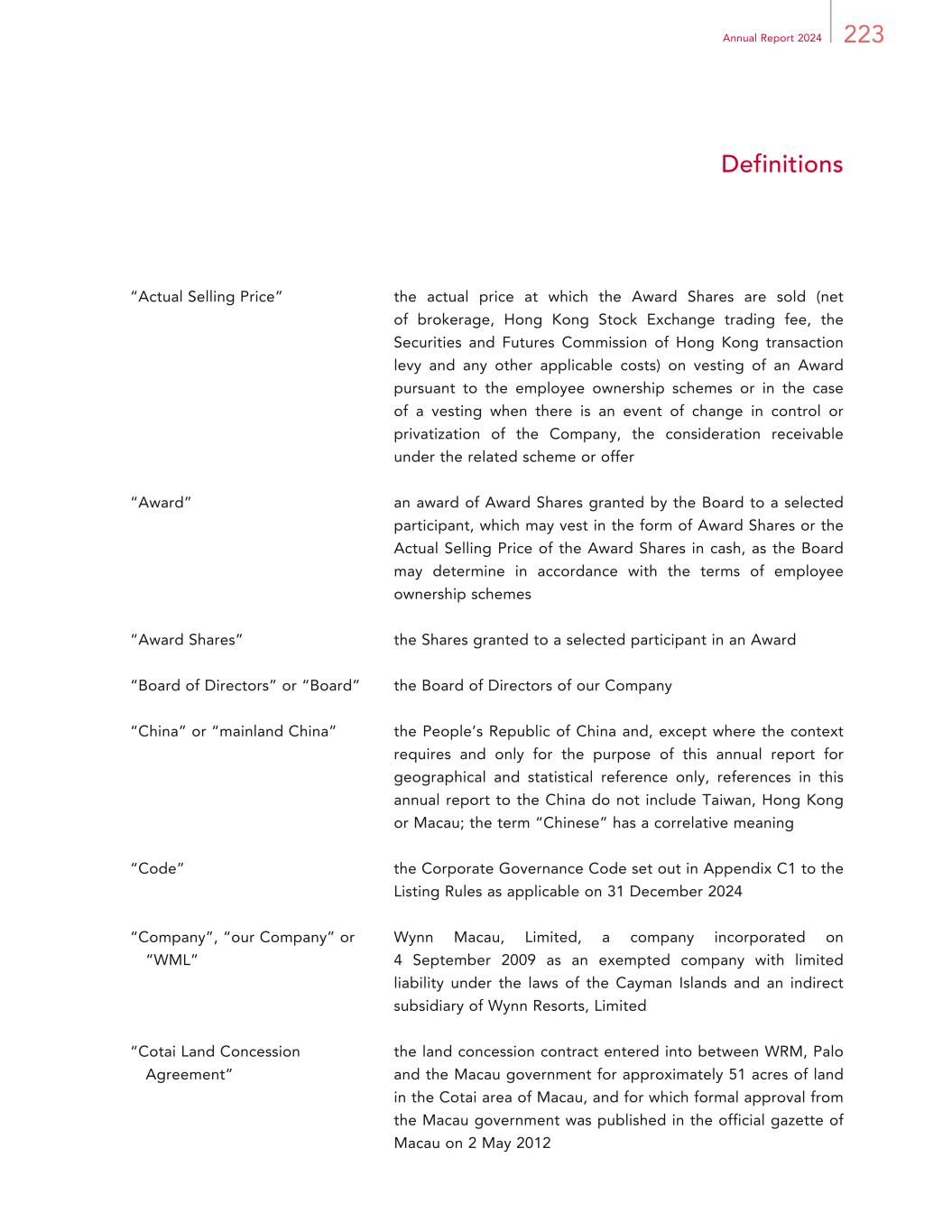 223Annual Report 2024 Definitions “Actual Selling Price” the actual price at which the Award Shares are sold (net of brokerage, Hong Kong Stock Exchange trading fee, the Securities and Futures Commission of Hong Kong transaction levy and any other applicable costs) on vesting of an Award pursuant to the employee ownership schemes or in the case of a vesting when there is an event of change in control or privatization of the Company, the consideration receivable under the related scheme or offer “Award” an award of Award Shares granted by the Board to a selected participant, which may vest in the form of Award Shares or the Actual Selling Price of the Award Shares in cash, as the Board may determine in accordance with the terms of employee ownership schemes “Award Shares” the Shares granted to a selected participant in an Award “Board of Directors” or “Board” the Board of Directors of our Company “China” or “mainland China” the People’s Republic of China and, except where the context requires and only for the purpose of this annual report for geographical and statistical reference only, references in this annual report to the China do not include Taiwan, Hong Kong or Macau; the term “Chinese” has a correlative meaning “Code” the Corporate Governance Code set out in Appendix C1 to the Listing Rules as applicable on 31 December 2024 “Company”, “our Company” or “WML” Wynn Macau, Limited, a company incorporated on 4 September 2009 as an exempted company with limited liability under the laws of the Cayman Islands and an indirect subsidiary of Wynn Resorts, Limited “Cotai Land Concession Agreement” the land concession contract entered into between WRM, Palo and the Macau government for approximately 51 acres of land in the Cotai area of Macau, and for which formal approval from the Macau government was published in the official gazette of Macau on 2 May 2012