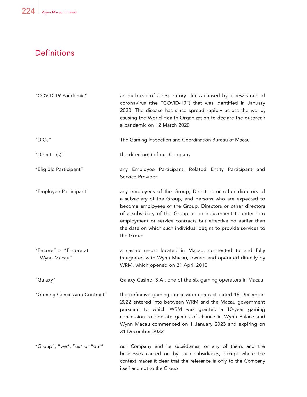 224 Wynn Macau, Limited Definitions “COVID-19 Pandemic” an outbreak of a respiratory illness caused by a new strain of coronavirus (the “COVID-19”) that was identified in January 2020. The disease has since spread rapidly across the world, causing the World Health Organization to declare the outbreak a pandemic on 12 March 2020 “DICJ” The Gaming Inspection and Coordination Bureau of Macau “Director(s)” the director(s) of our Company “Eligible Participant” any Employee Participant, Related Entity Participant and Service Provider “Employee Participant” any employees of the Group, Directors or other directors of a subsidiary of the Group, and persons who are expected to become employees of the Group, Directors or other directors of a subsidiary of the Group as an inducement to enter into employment or service contracts but effective no earlier than the date on which such individual begins to provide services to the Group “Encore” or “Encore at Wynn Macau” a casino resort located in Macau, connected to and fully integrated with Wynn Macau, owned and operated directly by WRM, which opened on 21 April 2010 “Galaxy” Galaxy Casino, S.A., one of the six gaming operators in Macau “Gaming Concession Contract” the definitive gaming concession contract dated 16 December 2022 entered into between WRM and the Macau government pursuant to which WRM was granted a 10-year gaming concession to operate games of chance in Wynn Palace and Wynn Macau commenced on 1 January 2023 and expiring on 31 December 2032 “Group”, “we”, “us” or “our” our Company and its subsidiaries, or any of them, and the businesses carried on by such subsidiaries, except where the context makes it clear that the reference is only to the Company itself and not to the Group