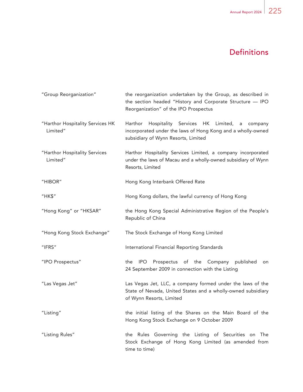 225Annual Report 2024 Definitions “Group Reorganization” the reorganization undertaken by the Group, as described in the section headed “History and Corporate Structure — IPO Reorganization” of the IPO Prospectus “Harthor Hospitality Services HK Limited” Harthor Hospitality Services HK Limited, a company incorporated under the laws of Hong Kong and a wholly-owned subsidiary of Wynn Resorts, Limited “Harthor Hospitality Services Limited” Harthor Hospitality Services Limited, a company incorporated under the laws of Macau and a wholly-owned subsidiary of Wynn Resorts, Limited “HIBOR” Hong Kong Interbank Offered Rate “HK$” Hong Kong dollars, the lawful currency of Hong Kong “Hong Kong” or “HKSAR” the Hong Kong Special Administrative Region of the People’s Republic of China “Hong Kong Stock Exchange” The Stock Exchange of Hong Kong Limited “IFRS” International Financial Reporting Standards “IPO Prospectus” the IPO Prospectus of the Company published on 24 September 2009 in connection with the Listing “Las Vegas Jet” Las Vegas Jet, LLC, a company formed under the laws of the State of Nevada, United States and a wholly-owned subsidiary of Wynn Resorts, Limited “Listing” the initial listing of the Shares on the Main Board of the Hong Kong Stock Exchange on 9 October 2009 “Listing Rules” the Rules Governing the Listing of Securities on The Stock Exchange of Hong Kong Limited (as amended from time to time)