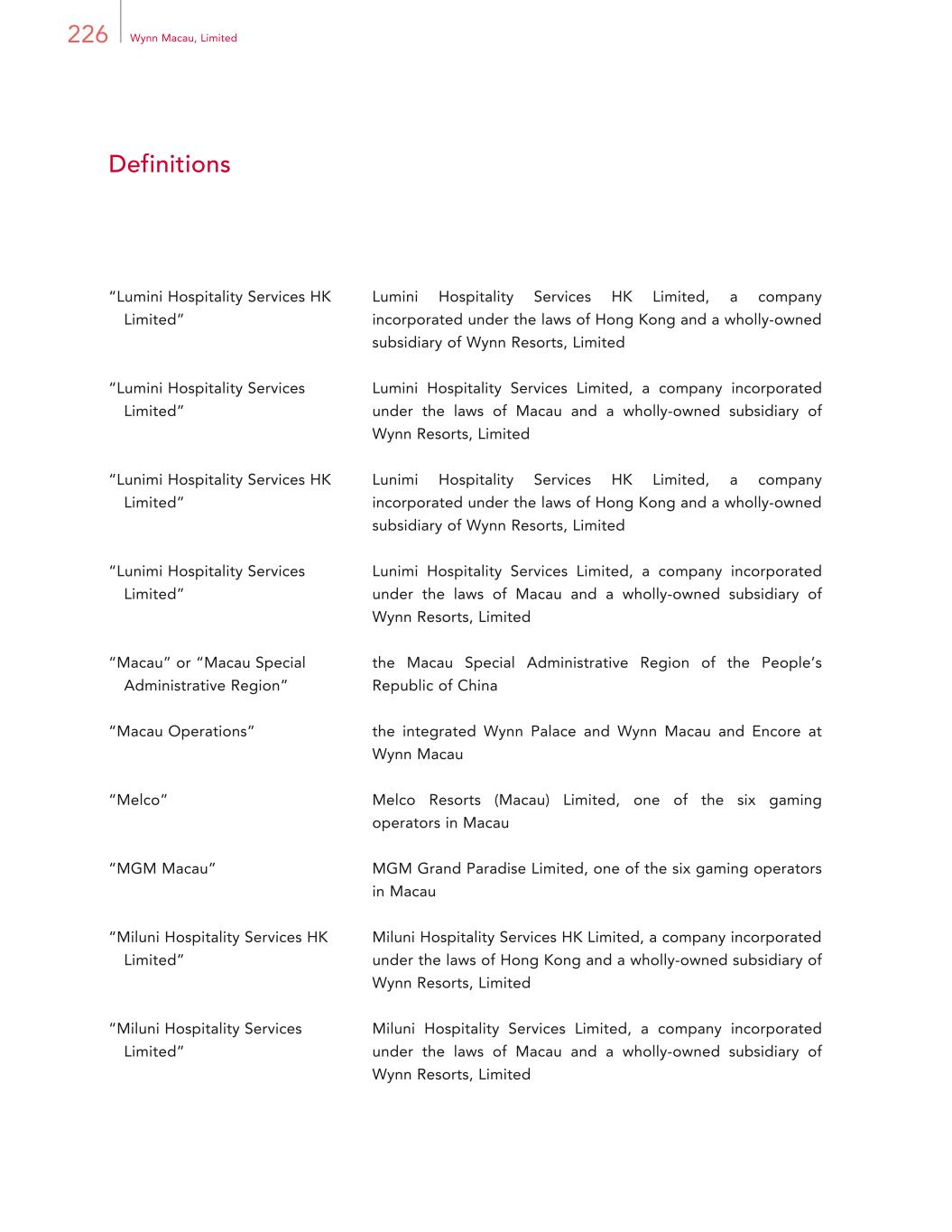 226 Wynn Macau, Limited Definitions “Lumini Hospitality Services HK Limited” Lumini Hospitality Services HK Limited, a company incorporated under the laws of Hong Kong and a wholly-owned subsidiary of Wynn Resorts, Limited “Lumini Hospitality Services Limited” Lumini Hospitality Services Limited, a company incorporated under the laws of Macau and a wholly-owned subsidiary of Wynn Resorts, Limited “Lunimi Hospitality Services HK Limited” Lunimi Hospitality Services HK Limited, a company incorporated under the laws of Hong Kong and a wholly-owned subsidiary of Wynn Resorts, Limited “Lunimi Hospitality Services Limited” Lunimi Hospitality Services Limited, a company incorporated under the laws of Macau and a wholly-owned subsidiary of Wynn Resorts, Limited “Macau” or “Macau Special Administrative Region” the Macau Special Administrative Region of the People’s Republic of China “Macau Operations” the integrated Wynn Palace and Wynn Macau and Encore at Wynn Macau “Melco” Melco Resorts (Macau) Limited, one of the six gaming operators in Macau “MGM Macau” MGM Grand Paradise Limited, one of the six gaming operators in Macau “Miluni Hospitality Services HK Limited” Miluni Hospitality Services HK Limited, a company incorporated under the laws of Hong Kong and a wholly-owned subsidiary of Wynn Resorts, Limited “Miluni Hospitality Services Limited” Miluni Hospitality Services Limited, a company incorporated under the laws of Macau and a wholly-owned subsidiary of Wynn Resorts, Limited