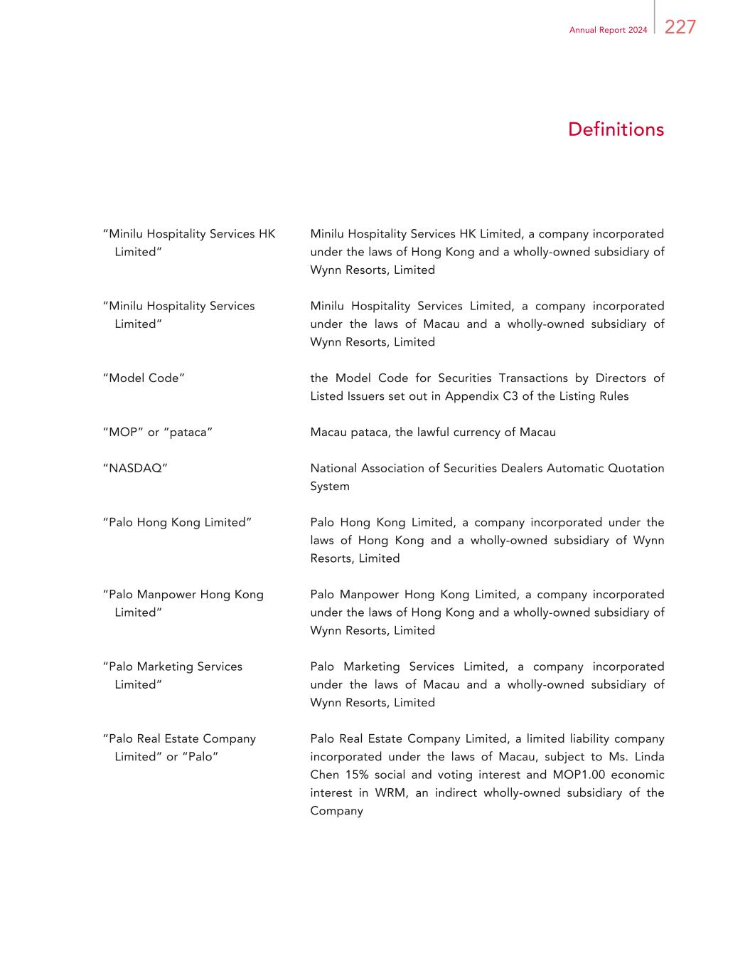 227Annual Report 2024 Definitions “Minilu Hospitality Services HK Limited” Minilu Hospitality Services HK Limited, a company incorporated under the laws of Hong Kong and a wholly-owned subsidiary of Wynn Resorts, Limited “Minilu Hospitality Services Limited” Minilu Hospitality Services Limited, a company incorporated under the laws of Macau and a wholly-owned subsidiary of Wynn Resorts, Limited “Model Code” the Model Code for Securities Transactions by Directors of Listed Issuers set out in Appendix C3 of the Listing Rules “MOP” or “pataca” Macau pataca, the lawful currency of Macau “NASDAQ” National Association of Securities Dealers Automatic Quotation System “Palo Hong Kong Limited” Palo Hong Kong Limited, a company incorporated under the laws of Hong Kong and a wholly-owned subsidiary of Wynn Resorts, Limited “Palo Manpower Hong Kong Limited” Palo Manpower Hong Kong Limited, a company incorporated under the laws of Hong Kong and a wholly-owned subsidiary of Wynn Resorts, Limited “Palo Marketing Services Limited” Palo Marketing Services Limited, a company incorporated under the laws of Macau and a wholly-owned subsidiary of Wynn Resorts, Limited “Palo Real Estate Company Limited” or “Palo” Palo Real Estate Company Limited, a limited liability company incorporated under the laws of Macau, subject to Ms. Linda Chen 15% social and voting interest and MOP1.00 economic interest in WRM, an indirect wholly-owned subsidiary of the Company