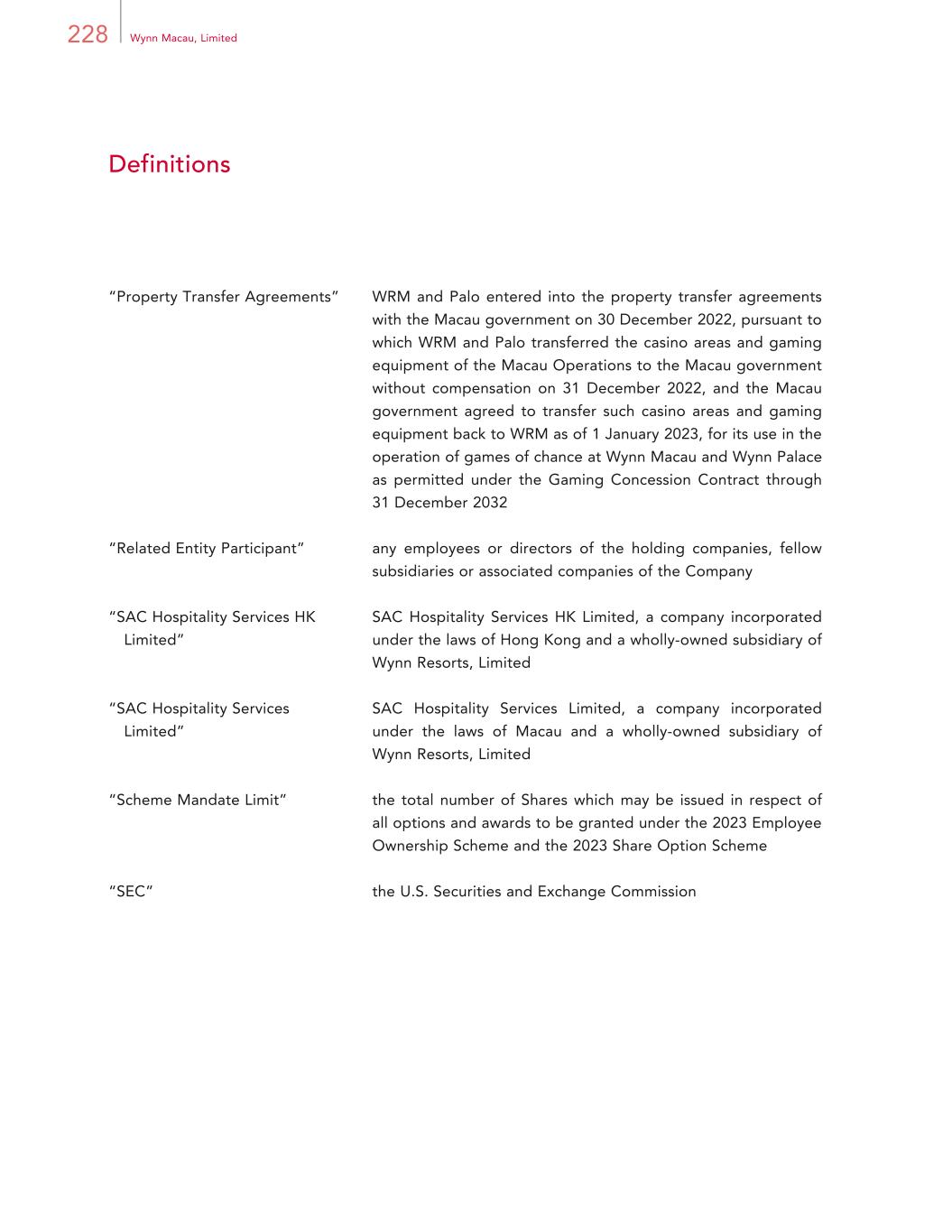 228 Wynn Macau, Limited Definitions “Property Transfer Agreements” WRM and Palo entered into the property transfer agreements with the Macau government on 30 December 2022, pursuant to which WRM and Palo transferred the casino areas and gaming equipment of the Macau Operations to the Macau government without compensation on 31 December 2022, and the Macau government agreed to transfer such casino areas and gaming equipment back to WRM as of 1 January 2023, for its use in the operation of games of chance at Wynn Macau and Wynn Palace as permitted under the Gaming Concession Contract through 31 December 2032 “Related Entity Participant” any employees or directors of the holding companies, fellow subsidiaries or associated companies of the Company “SAC Hospitality Services HK Limited” SAC Hospitality Services HK Limited, a company incorporated under the laws of Hong Kong and a wholly-owned subsidiary of Wynn Resorts, Limited “SAC Hospitality Services Limited” SAC Hospitality Services Limited, a company incorporated under the laws of Macau and a wholly-owned subsidiary of Wynn Resorts, Limited “Scheme Mandate Limit” the total number of Shares which may be issued in respect of all options and awards to be granted under the 2023 Employee Ownership Scheme and the 2023 Share Option Scheme “SEC” the U.S. Securities and Exchange Commission