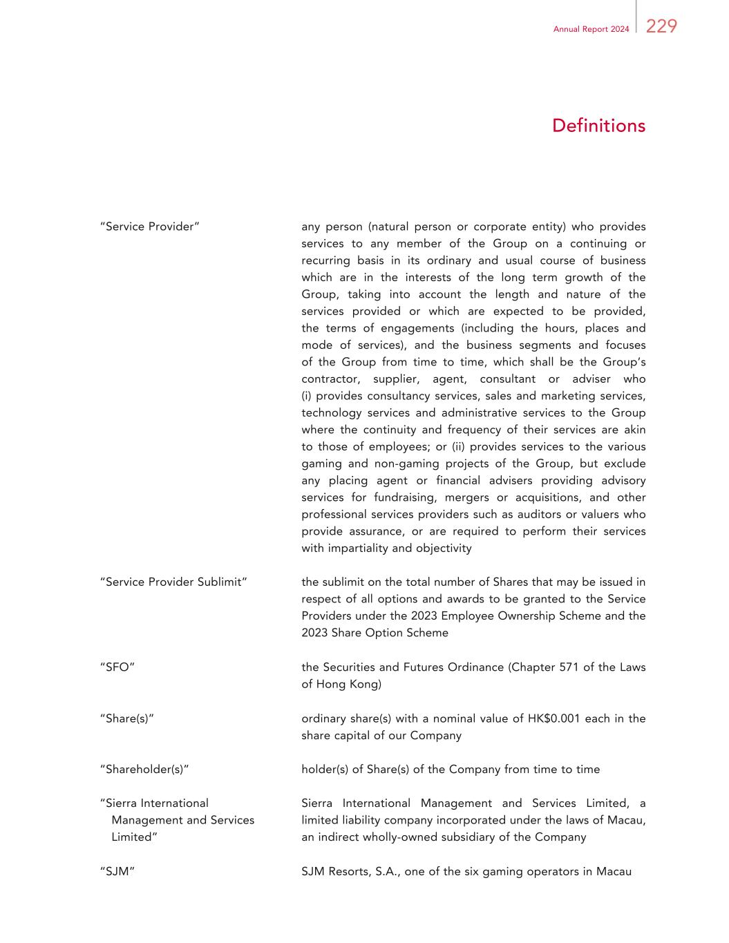 229Annual Report 2024 Definitions “Service Provider” any person (natural person or corporate entity) who provides services to any member of the Group on a continuing or recurring basis in its ordinary and usual course of business which are in the interests of the long term growth of the Group, taking into account the length and nature of the services provided or which are expected to be provided, the terms of engagements (including the hours, places and mode of services), and the business segments and focuses of the Group from time to time, which shall be the Group’s contractor, supplier, agent, consultant or adviser who (i) provides consultancy services, sales and marketing services, technology services and administrative services to the Group where the continuity and frequency of their services are akin to those of employees; or (ii) provides services to the various gaming and non-gaming projects of the Group, but exclude any placing agent or financial advisers providing advisory services for fundraising, mergers or acquisitions, and other professional services providers such as auditors or valuers who provide assurance, or are required to perform their services with impartiality and objectivity “Service Provider Sublimit” the sublimit on the total number of Shares that may be issued in respect of all options and awards to be granted to the Service Providers under the 2023 Employee Ownership Scheme and the 2023 Share Option Scheme “SFO” the Securities and Futures Ordinance (Chapter 571 of the Laws of Hong Kong) “Share(s)” ordinary share(s) with a nominal value of HK$0.001 each in the share capital of our Company “Shareholder(s)” holder(s) of Share(s) of the Company from time to time “Sierra International Management and Services Limited” Sierra International Management and Services Limited, a limited liability company incorporated under the laws of Macau, an indirect wholly-owned subsidiary of the Company “SJM” SJM Resorts, S.A., one of the six gaming operators in Macau