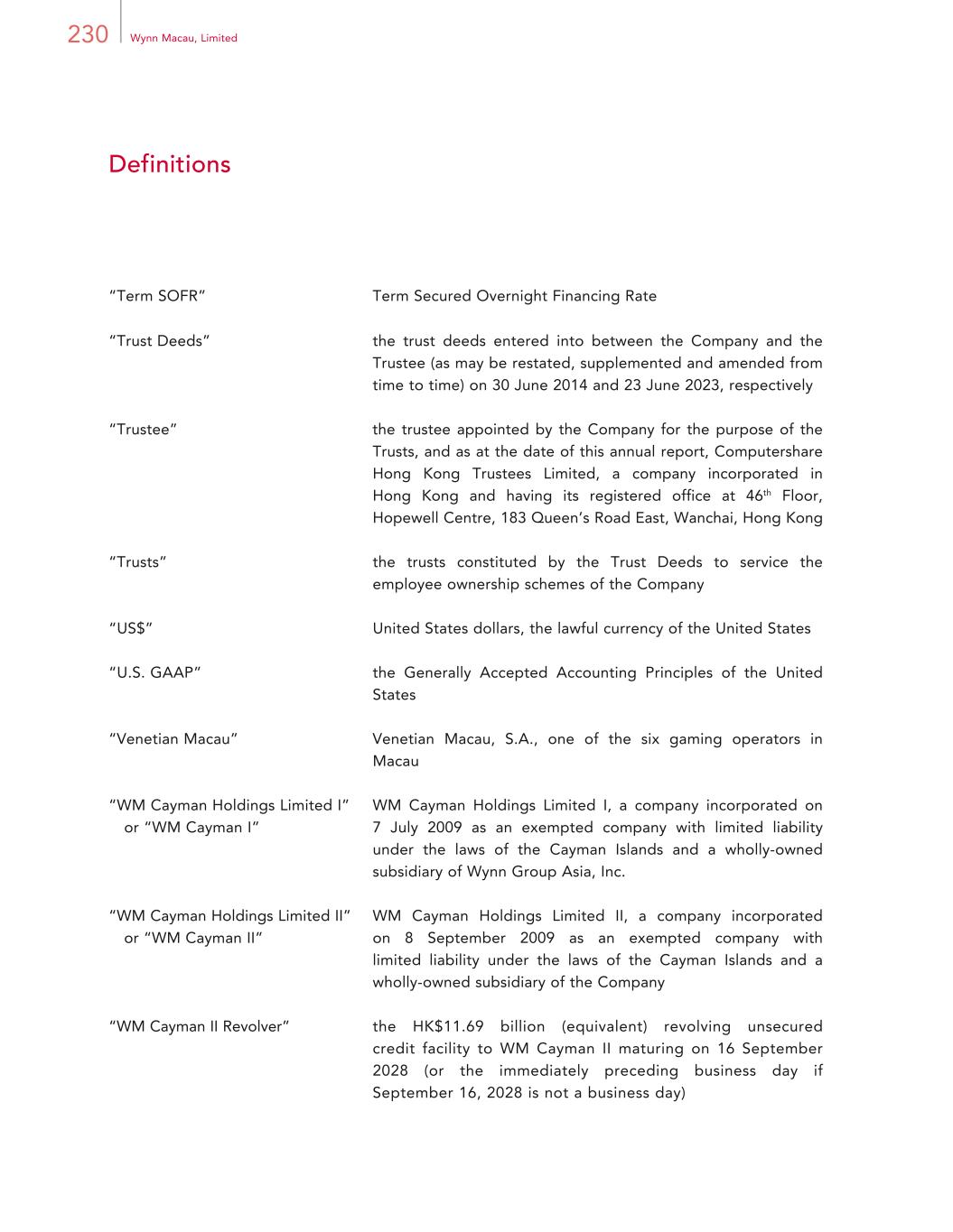 230 Wynn Macau, Limited Definitions “Term SOFR” Term Secured Overnight Financing Rate “Trust Deeds” the trust deeds entered into between the Company and the Trustee (as may be restated, supplemented and amended from time to time) on 30 June 2014 and 23 June 2023, respectively “Trustee” the trustee appointed by the Company for the purpose of the Trusts, and as at the date of this annual report, Computershare Hong Kong Trustees Limited, a company incorporated in Hong Kong and having its registered office at 46th Floor, Hopewell Centre, 183 Queen’s Road East, Wanchai, Hong Kong “Trusts” the trusts constituted by the Trust Deeds to service the employee ownership schemes of the Company “US$” United States dollars, the lawful currency of the United States “U.S. GAAP” the Generally Accepted Accounting Principles of the United States “Venetian Macau” Venetian Macau, S.A., one of the six gaming operators in Macau “WM Cayman Holdings Limited I” or “WM Cayman I” WM Cayman Holdings Limited I, a company incorporated on 7 July 2009 as an exempted company with limited liability under the laws of the Cayman Islands and a wholly-owned subsidiary of Wynn Group Asia, Inc. “WM Cayman Holdings Limited II” or “WM Cayman II” WM Cayman Holdings Limited II, a company incorporated on 8 September 2009 as an exempted company with limited liability under the laws of the Cayman Islands and a wholly-owned subsidiary of the Company “WM Cayman II Revolver” the HK$11.69 billion (equivalent) revolving unsecured credit facility to WM Cayman II maturing on 16 September 2028 (or the immediately preceding business day if September 16, 2028 is not a business day)