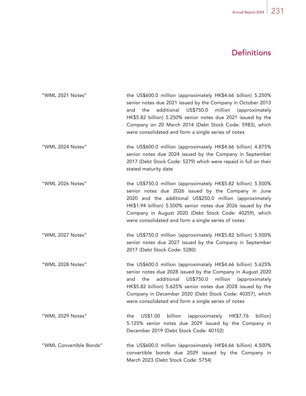 231Annual Report 2024 Definitions “WML 2021 Notes” the US$600.0 million (approximately HK$4.66 billion) 5.250% senior notes due 2021 issued by the Company in October 2013 and the additional US$750.0 million (approximately HK$5.82 billion) 5.250% senior notes due 2021 issued by the Company on 20 March 2014 (Debt Stock Code: 5983), which were consolidated and form a single series of notes “WML 2024 Notes” the US$600.0 million (approximately HK$4.66 billion) 4.875% senior notes due 2024 issued by the Company in September 2017 (Debt Stock Code: 5279) which were repaid in full on their stated maturity date “WML 2026 Notes” the US$750.0 million (approximately HK$5.82 billion) 5.500% senior notes due 2026 issued by the Company in June 2020 and the additional US$250.0 million (approximately HK$1.94 billion) 5.500% senior notes due 2026 issued by the Company in August 2020 (Debt Stock Code: 40259), which were consolidated and form a single series of notes “WML 2027 Notes” the US$750.0 million (approximately HK$5.82 billion) 5.500% senior notes due 2027 issued by the Company in September 2017 (Debt Stock Code: 5280) “WML 2028 Notes” the US$600.0 million (approximately HK$4.66 billion) 5.625% senior notes due 2028 issued by the Company in August 2020 and the additional US$750.0 million (approximately HK$5.82 billion) 5.625% senior notes due 2028 issued by the Company in December 2020 (Debt Stock Code: 40357), which were consolidated and form a single series of notes “WML 2029 Notes” the US$1.00 billion (approximately HK$7.76 billion) 5.125% senior notes due 2029 issued by the Company in December 2019 (Debt Stock Code: 40102) “WML Convertible Bonds” the US$600.0 million (approximately HK$4.66 billion) 4.500% convertible bonds due 2029 issued by the Company in March 2023 (Debt Stock Code: 5754)