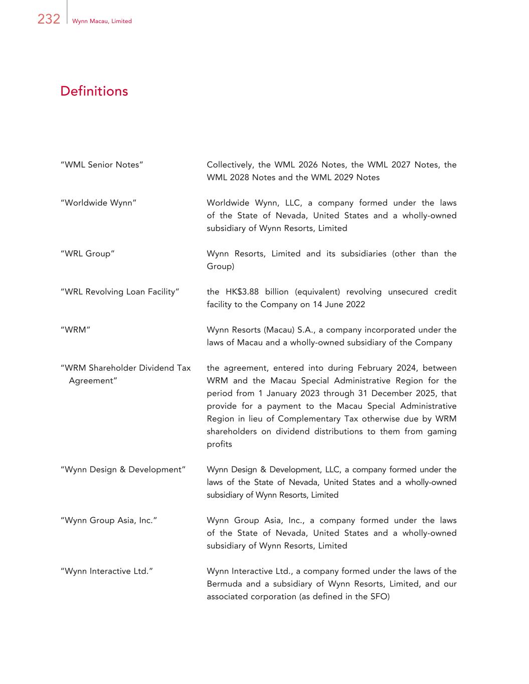 232 Wynn Macau, Limited Definitions “WML Senior Notes” Collectively, the WML 2026 Notes, the WML 2027 Notes, the WML 2028 Notes and the WML 2029 Notes “Worldwide Wynn” Worldwide Wynn, LLC, a company formed under the laws of the State of Nevada, United States and a wholly-owned subsidiary of Wynn Resorts, Limited “WRL Group” Wynn Resorts, Limited and its subsidiaries (other than the Group) “WRL Revolving Loan Facility” the HK$3.88 billion (equivalent) revolving unsecured credit facility to the Company on 14 June 2022 “WRM” Wynn Resorts (Macau) S.A., a company incorporated under the laws of Macau and a wholly-owned subsidiary of the Company “WRM Shareholder Dividend Tax Agreement” the agreement, entered into during February 2024, between WRM and the Macau Special Administrative Region for the period from 1 January 2023 through 31 December 2025, that provide for a payment to the Macau Special Administrative Region in lieu of Complementary Tax otherwise due by WRM shareholders on dividend distributions to them from gaming profits “Wynn Design & Development” Wynn Design & Development, LLC, a company formed under the laws of the State of Nevada, United States and a wholly-owned subsidiary of Wynn Resorts, Limited “Wynn Group Asia, Inc.” Wynn Group Asia, Inc., a company formed under the laws of the State of Nevada, United States and a wholly-owned subsidiary of Wynn Resorts, Limited “Wynn Interactive Ltd.” Wynn Interactive Ltd., a company formed under the laws of the Bermuda and a subsidiary of Wynn Resorts, Limited, and our associated corporation (as defined in the SFO)