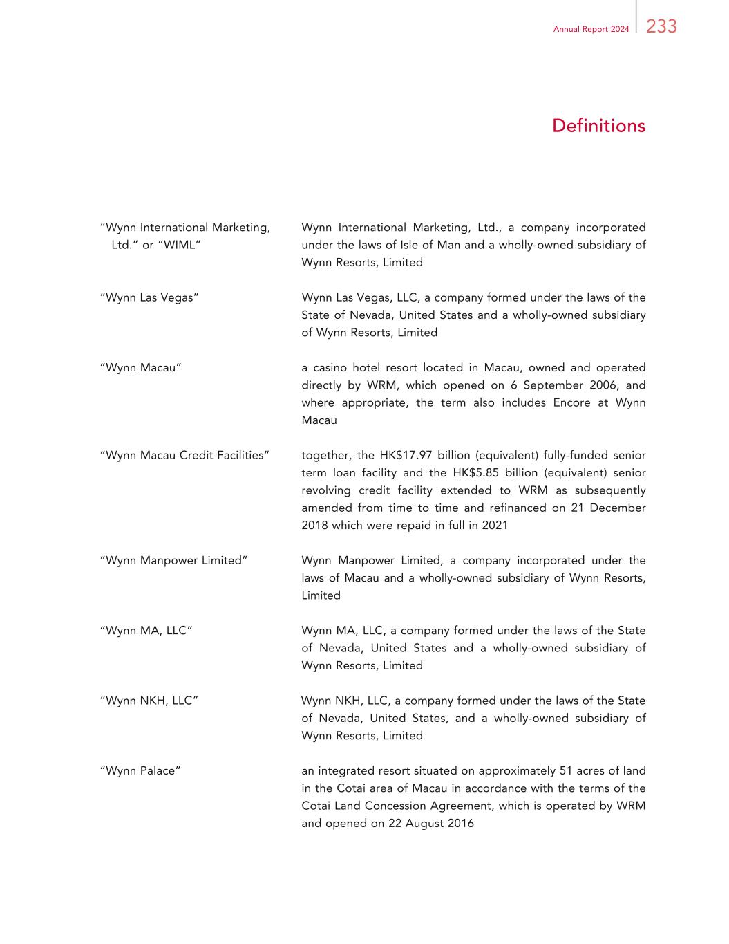 233Annual Report 2024 Definitions “Wynn International Marketing, Ltd.” or “WIML” Wynn International Marketing, Ltd., a company incorporated under the laws of Isle of Man and a wholly-owned subsidiary of Wynn Resorts, Limited “Wynn Las Vegas” Wynn Las Vegas, LLC, a company formed under the laws of the State of Nevada, United States and a wholly-owned subsidiary of Wynn Resorts, Limited “Wynn Macau” a casino hotel resort located in Macau, owned and operated directly by WRM, which opened on 6 September 2006, and where appropriate, the term also includes Encore at Wynn Macau “Wynn Macau Credit Facilities” together, the HK$17.97 billion (equivalent) fully-funded senior term loan facility and the HK$5.85 billion (equivalent) senior revolving credit facility extended to WRM as subsequently amended from time to time and refinanced on 21 December 2018 which were repaid in full in 2021 “Wynn Manpower Limited” Wynn Manpower Limited, a company incorporated under the laws of Macau and a wholly-owned subsidiary of Wynn Resorts, Limited “Wynn MA, LLC” Wynn MA, LLC, a company formed under the laws of the State of Nevada, United States and a wholly-owned subsidiary of Wynn Resorts, Limited “Wynn NKH, LLC” Wynn NKH, LLC, a company formed under the laws of the State of Nevada, United States, and a wholly-owned subsidiary of Wynn Resorts, Limited “Wynn Palace” an integrated resort situated on approximately 51 acres of land in the Cotai area of Macau in accordance with the terms of the Cotai Land Concession Agreement, which is operated by WRM and opened on 22 August 2016