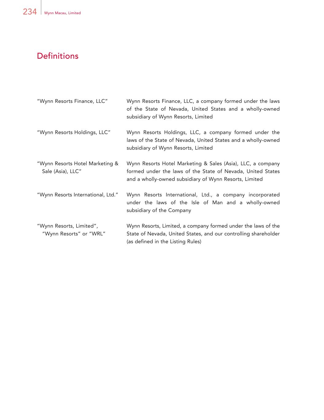 234 Wynn Macau, Limited Definitions “Wynn Resorts Finance, LLC” Wynn Resorts Finance, LLC, a company formed under the laws of the State of Nevada, United States and a wholly-owned subsidiary of Wynn Resorts, Limited “Wynn Resorts Holdings, LLC” Wynn Resorts Holdings, LLC, a company formed under the laws of the State of Nevada, United States and a wholly-owned subsidiary of Wynn Resorts, Limited “Wynn Resorts Hotel Marketing & Sale (Asia), LLC” Wynn Resorts Hotel Marketing & Sales (Asia), LLC, a company formed under the laws of the State of Nevada, United States and a wholly-owned subsidiary of Wynn Resorts, Limited “Wynn Resorts International, Ltd.” Wynn Resorts International, Ltd., a company incorporated under the laws of the Isle of Man and a wholly-owned subsidiary of the Company “Wynn Resorts, Limited”, “Wynn Resorts” or “WRL” Wynn Resorts, Limited, a company formed under the laws of the State of Nevada, United States, and our controlling shareholder (as defined in the Listing Rules)