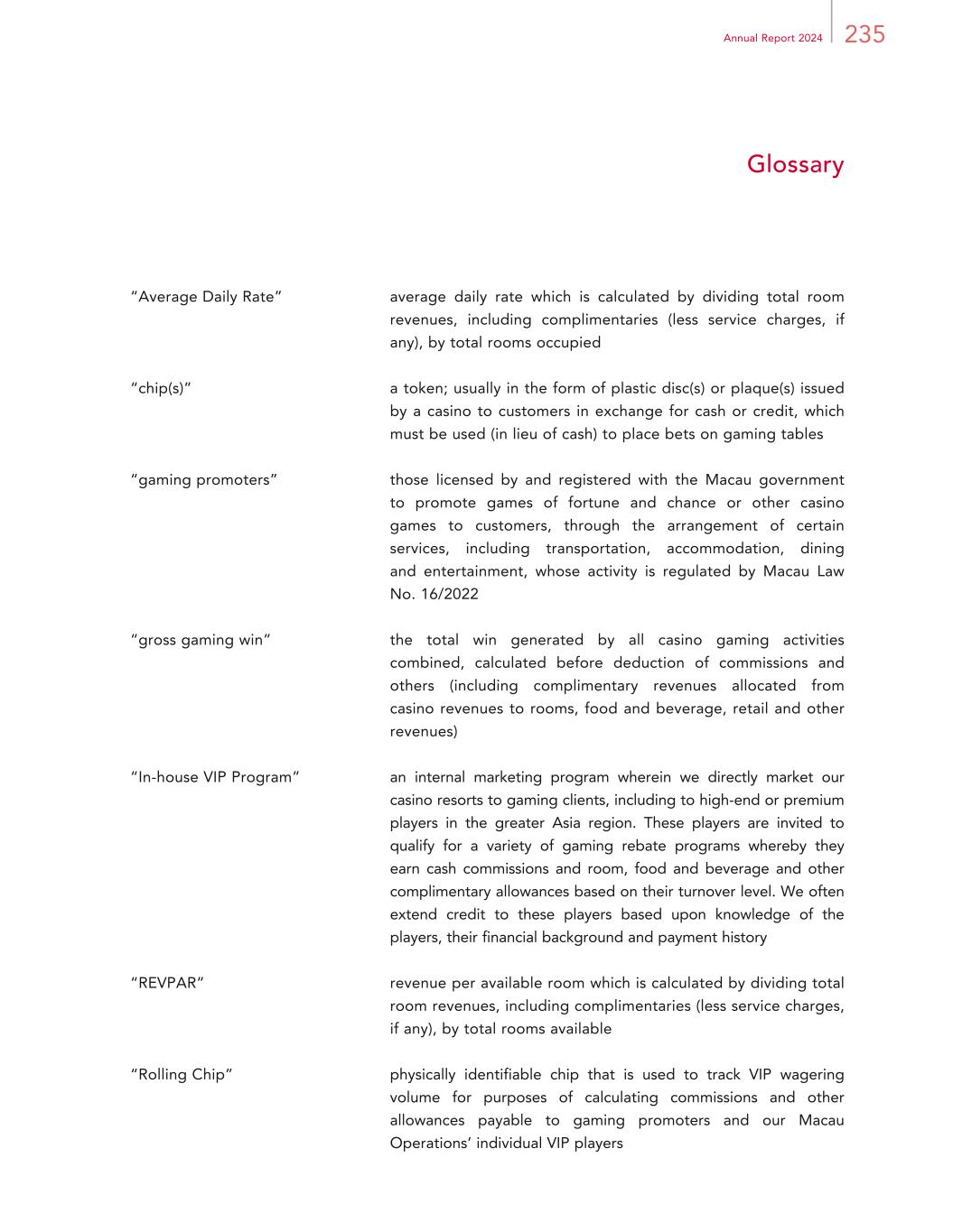 235Annual Report 2024 Glossary “Average Daily Rate” average daily rate which is calculated by dividing total room revenues, including complimentaries (less service charges, if any), by total rooms occupied “chip(s)” a token; usually in the form of plastic disc(s) or plaque(s) issued by a casino to customers in exchange for cash or credit, which must be used (in lieu of cash) to place bets on gaming tables “gaming promoters” those licensed by and registered with the Macau government to promote games of fortune and chance or other casino games to customers, through the arrangement of certain services, including transportation, accommodation, dining and entertainment, whose activity is regulated by Macau Law No. 16/2022 “gross gaming win” the total win generated by all casino gaming activities combined, calculated before deduction of commissions and others (including complimentary revenues allocated from casino revenues to rooms, food and beverage, retail and other revenues) “In-house VIP Program” an internal marketing program wherein we directly market our casino resorts to gaming clients, including to high-end or premium players in the greater Asia region. These players are invited to qualify for a variety of gaming rebate programs whereby they earn cash commissions and room, food and beverage and other complimentary allowances based on their turnover level. We often extend credit to these players based upon knowledge of the players, their financial background and payment history “REVPAR” revenue per available room which is calculated by dividing total room revenues, including complimentaries (less service charges, if any), by total rooms available “Rolling Chip” physically identifiable chip that is used to track VIP wagering volume for purposes of calculating commissions and other allowances payable to gaming promoters and our Macau Operations’ individual VIP players