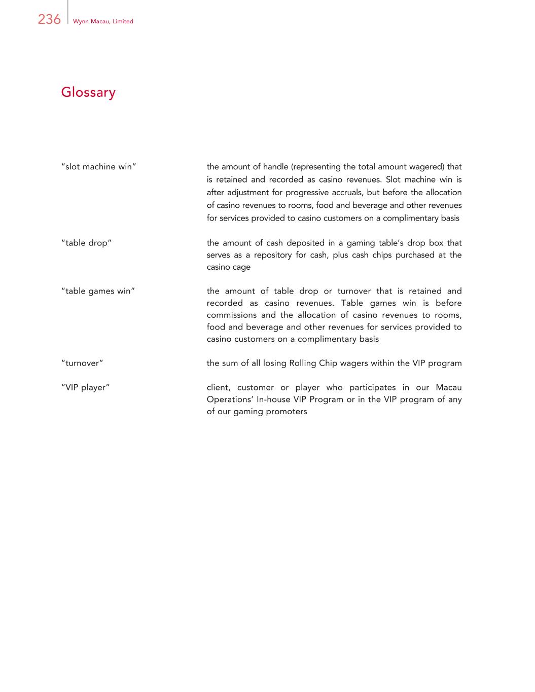 236 Wynn Macau, Limited Glossary “slot machine win” the amount of handle (representing the total amount wagered) that is retained and recorded as casino revenues. Slot machine win is after adjustment for progressive accruals, but before the allocation of casino revenues to rooms, food and beverage and other revenues for services provided to casino customers on a complimentary basis “table drop” the amount of cash deposited in a gaming table’s drop box that serves as a repository for cash, plus cash chips purchased at the casino cage “table games win” the amount of table drop or turnover that is retained and recorded as casino revenues. Table games win is before commissions and the allocation of casino revenues to rooms, food and beverage and other revenues for services provided to casino customers on a complimentary basis “turnover” the sum of all losing Rolling Chip wagers within the VIP program “VIP player” client, customer or player who participates in our Macau Operations’ In-house VIP Program or in the VIP program of any of our gaming promoters